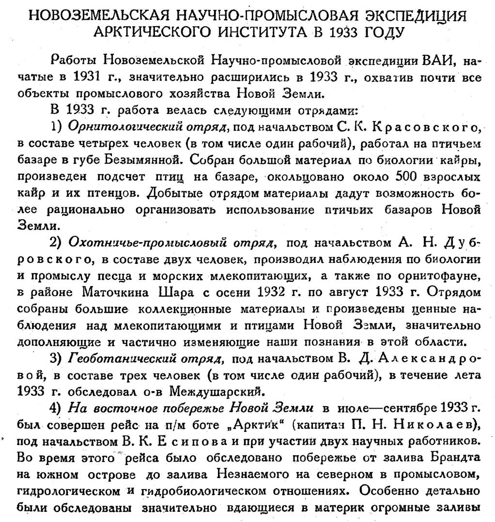 В 1933 г. Новоземельская научно-промысловая экспедиция будет работать в составе трех отрядов: 1) орнитологического, 2) геоботанического и 3) рыбопромыслового.