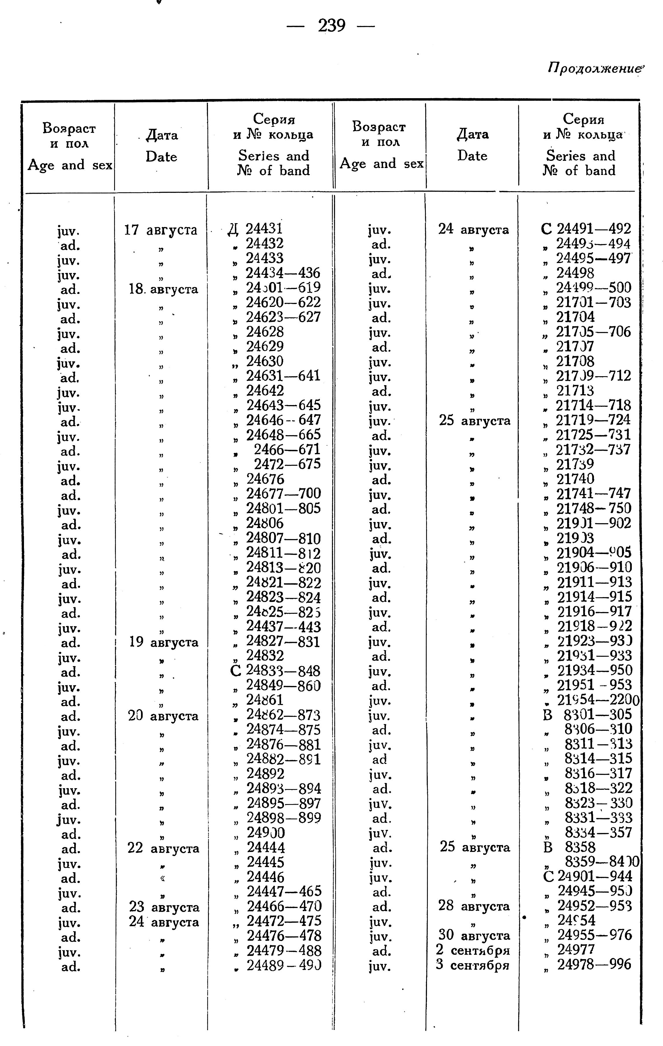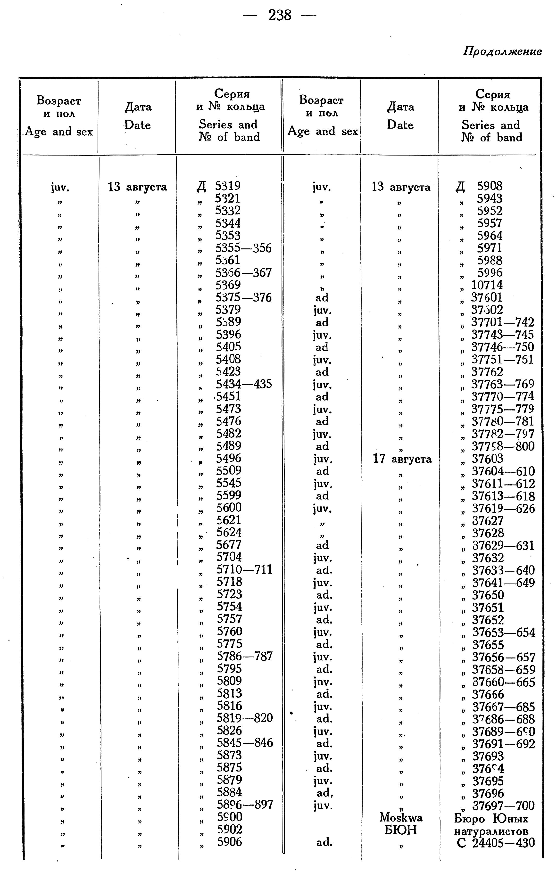 Наряду с этим были выловлены и выпущены птицы, окольцованные в 1933 г. Это были птицы, меченные кольцами БЮН серии Е 36 224, 36 309, 36 332 и 36 333. Кроме того промышленниками были убиты птицы с кольцами БЮН серии Е 36 320, 36 323, 36 327, 36 328, 36 344, 36 363, 36 394 и серии С 16 345 и 16 350.