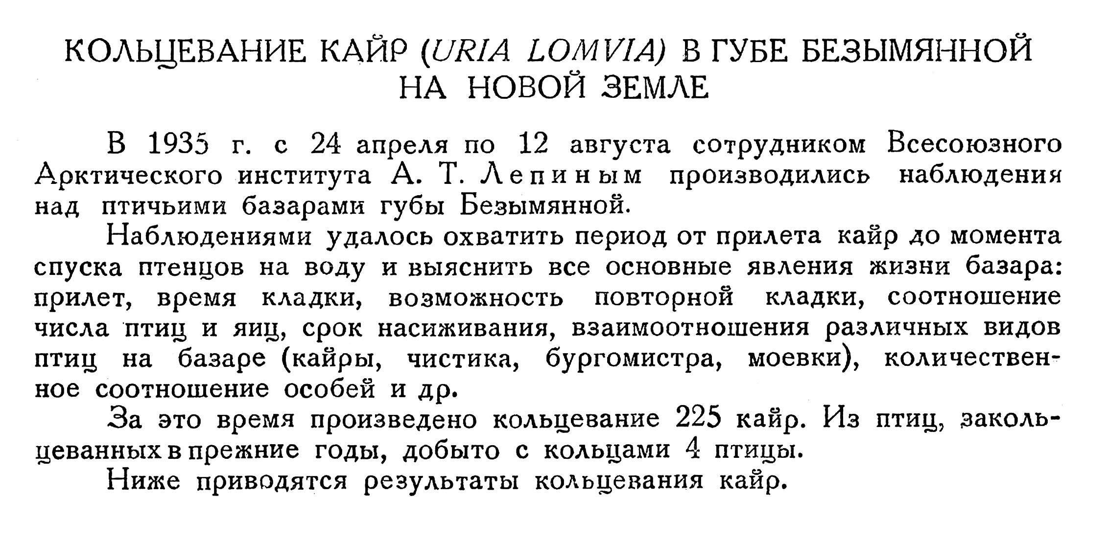 Летом 1934 г. на птичьем базаре Безымянной губы продолжались работы орнитологического отряда Новоземельской научно-промысловой экспедиции, имевшей своей задачей изучение биологии кайры, в связи с вопросами эксплоатации птичьих базаров. Наряду с другими методами биологических исследований птиц был применен метод кольцевания. {1}