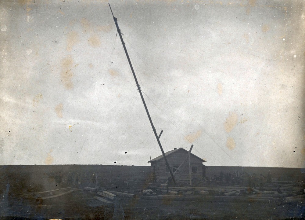 Это были мачты Шмидтовского радиоцентра, построенного в 1939-1940 годах. Высота опор 65 метров (22-этажный дом)! Возводили мачты в ручную. Каждая опора - связка из 4 брёвен. Строили методом наращивания. После монтажа мачт, полярники поставили ветряк и тоже в ручную.