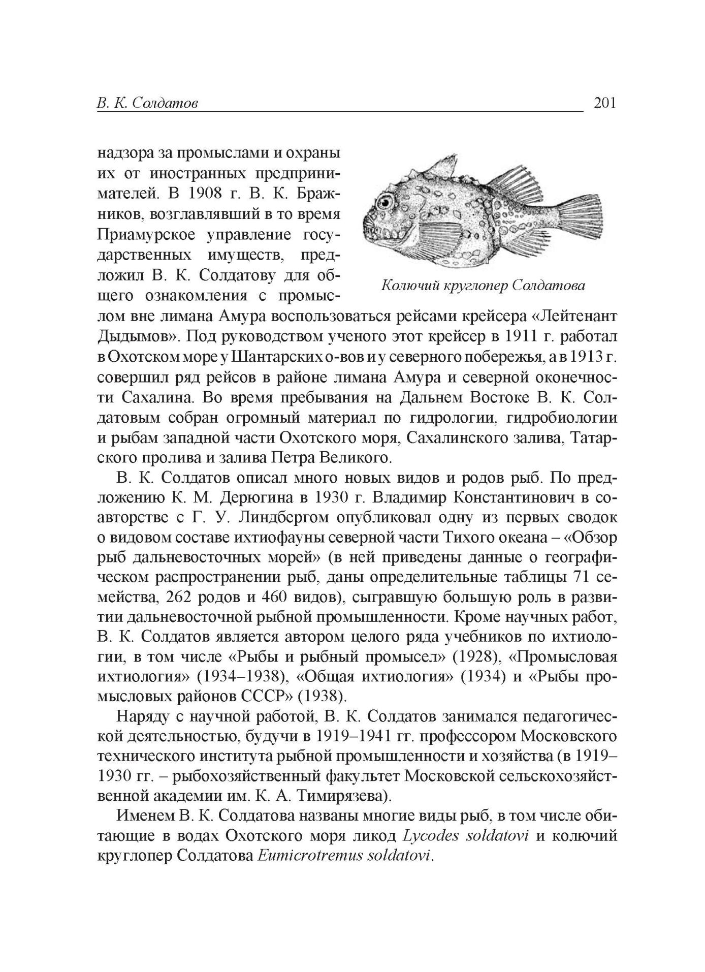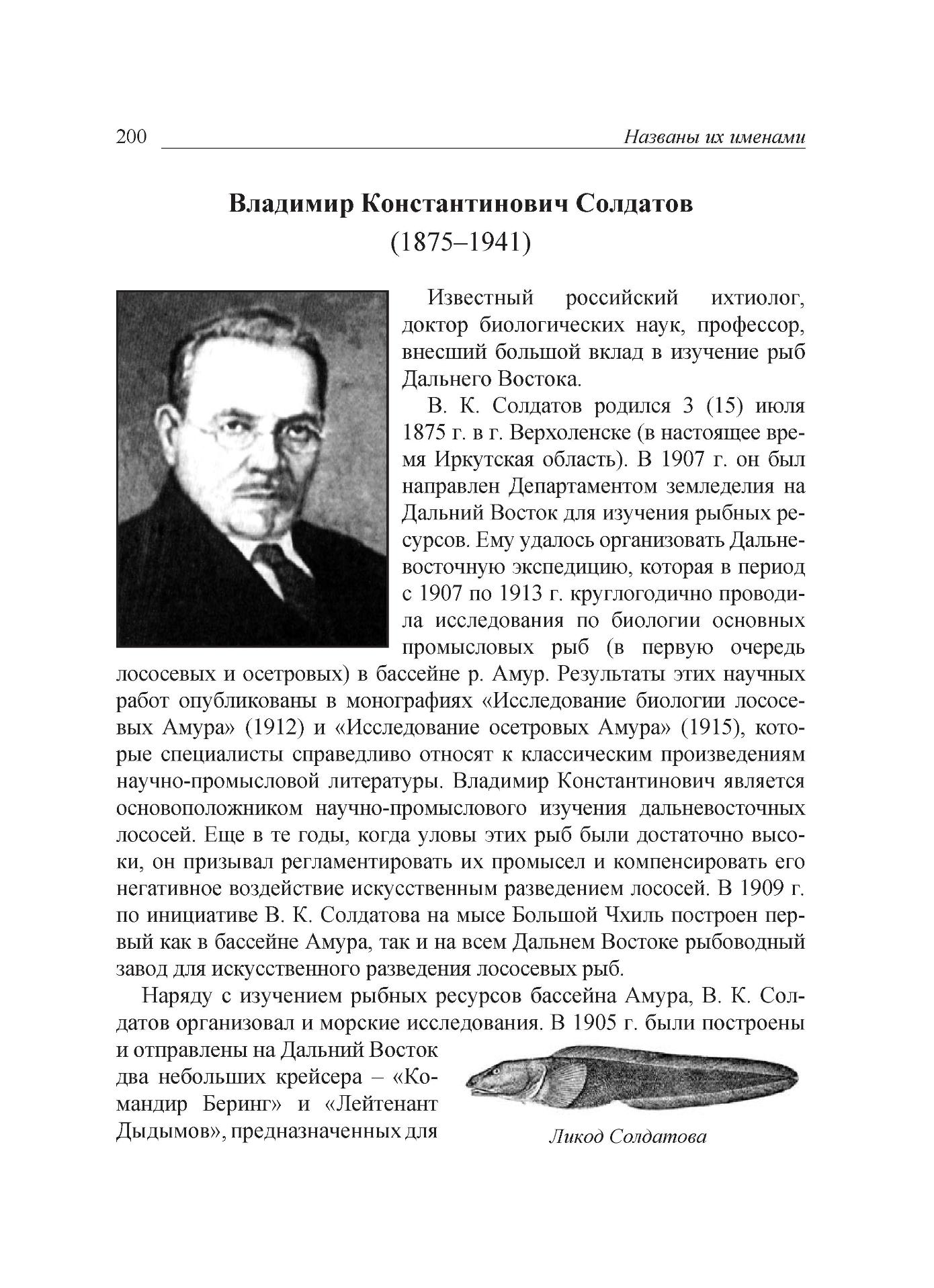 "... В 1907 г. Департаментом земледелия на Дальний Восток направлен ихтиолог Владимир Константинович Солдатов, где ему удается организовать Дальневосточную экспедицию по изучению рыбных ресурсов. 1907 - 1913 гг. - это период в основном круглогодичных работ по изучению биологии основных промысловых объектов в Амуре. В 1905 г. были построены и отправлены на Дальний Восток два небольших крейсера "Командир Беринг" и "Лейтенант Дыдымов", предназначенные для надзора за промыслами и их охраны от иностранных предпринимателей. В. К. Бражников, возглавлявший еще в 1908 г. Приамурское управление государственных имуществ, предложил В. К. Солдатову для общего ознакомления с промыслом вне лимана Амура воспользоваться рейсами крейсера "Лейтенант Дыдымов". Под руководством В. К. Солдатова крейсер "Лейтенант Дыдымов" в 1911 г. плавал в Охотском море у Шантарских островов и у северного побережья, а в 1913 г. совершил ряд рейсов в районе лимана Амура и северной оконечности Сахалина. В. К. Солдатов является основоположником широких научно-промысловых исследований дальневосточных лососей. Уже в те годы, когда уловы лососей были высокие (в сравнении с нашим временем), В. К. Солдатов призывал регламентировать промысел и компенсировать его негативное воздействие искусственным разведением лососей. "Ведение в широких размерах искусственного рыборазведения не как случайной меры, а как стройной государственной системы - это путь к увеличению производительности тех или иных бассейнов", считал В. К. Солдатов. Монографии В. К. Солдатова по лососевым и осетровым рыбам Амура в настоящее время стали уже библиографической редкостью и, к сожалению, становятся с каждым годом все менее доступны исследователям.