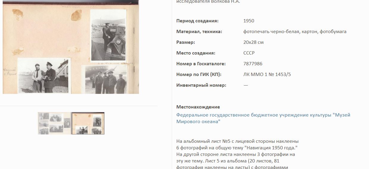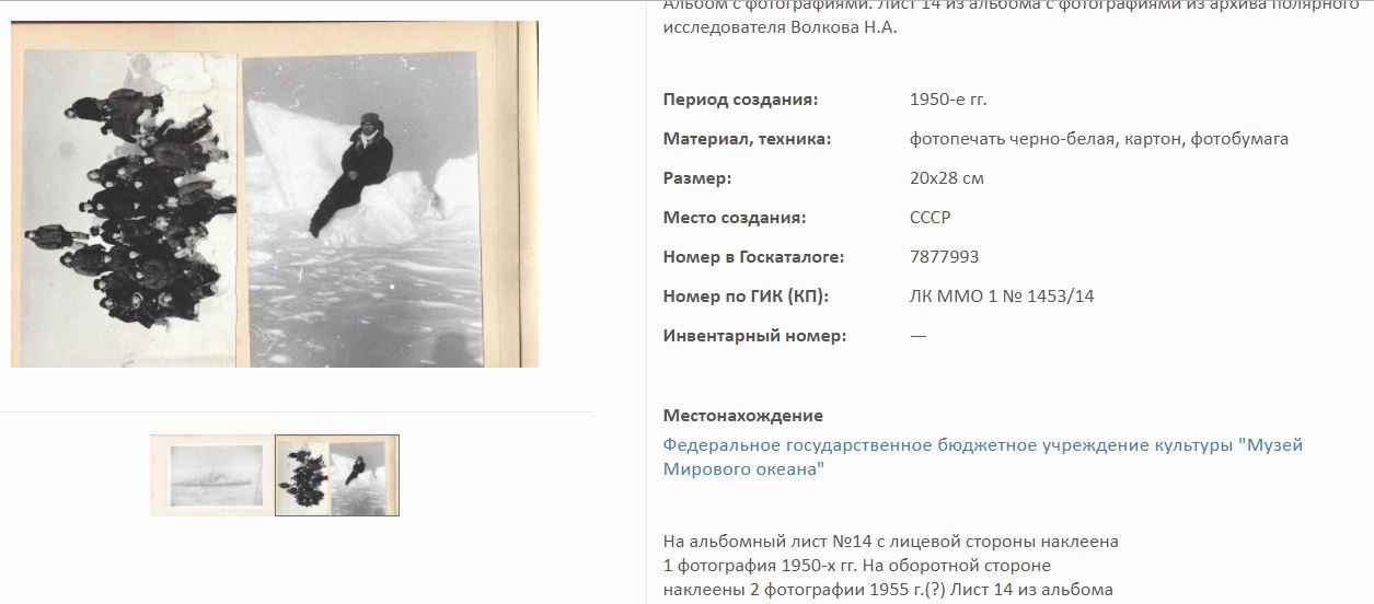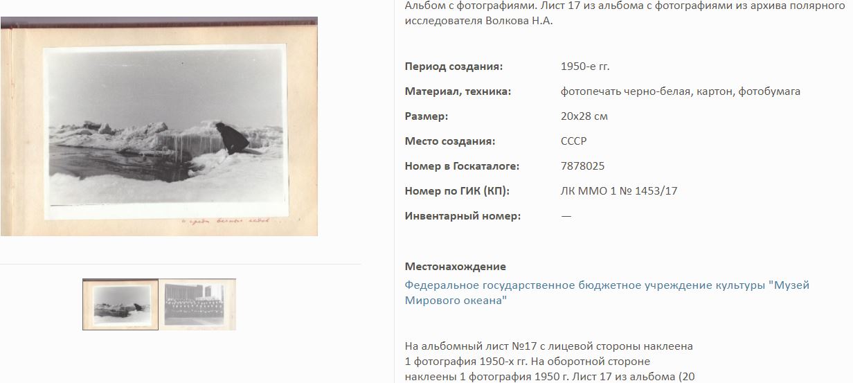 На сайте Госкаталог.РФ выложены экспонаты Калининградского Музея мирового океана. Среди них фотоальбом Волкова Н.А. по полярным исследованиям.