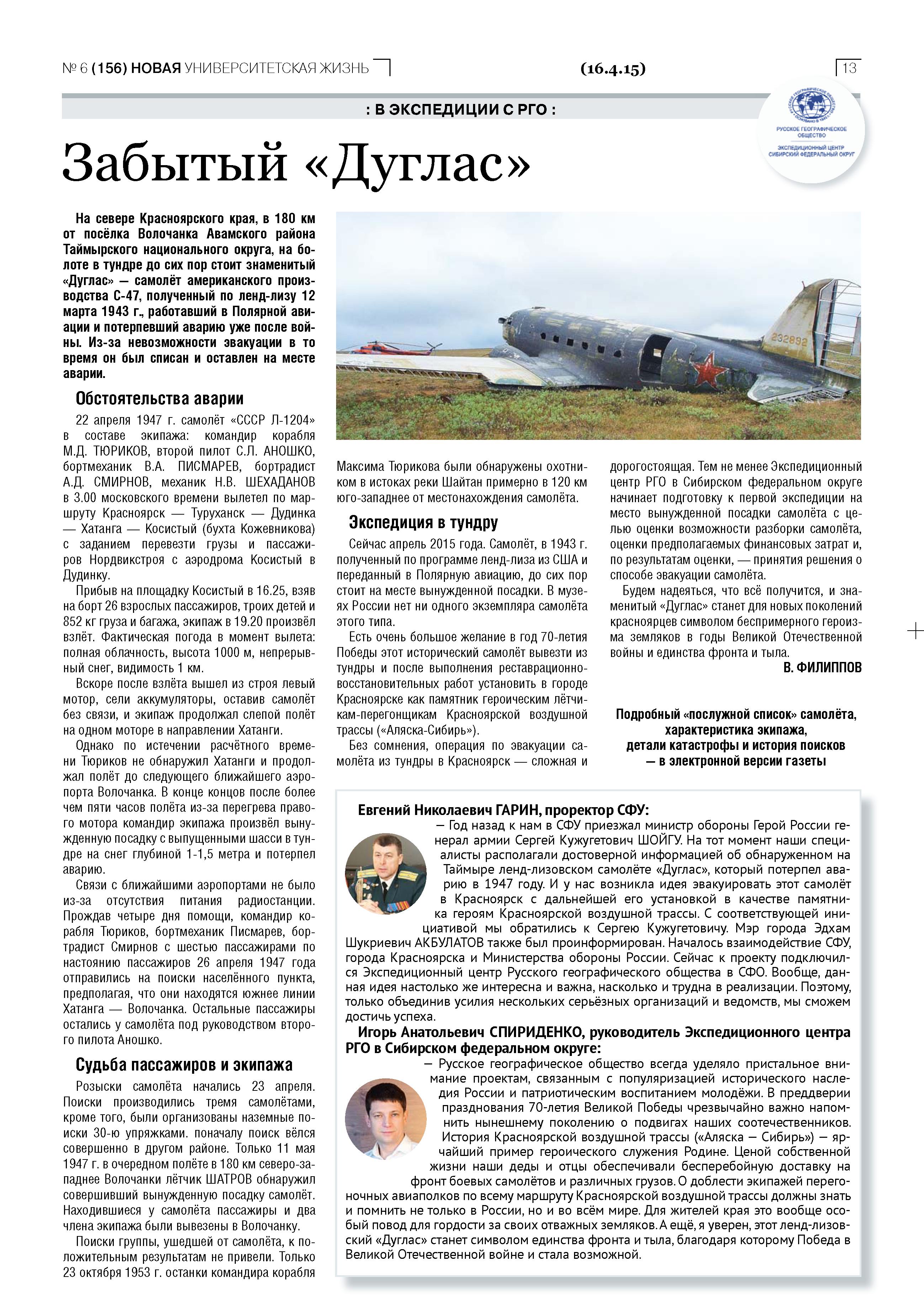 «С 1 октября 1947 г. исключить из списков личного состава 26 ТАО пропавших без вести 12 мая 1947 г. при аварии самолета С-47 № Л-1204: