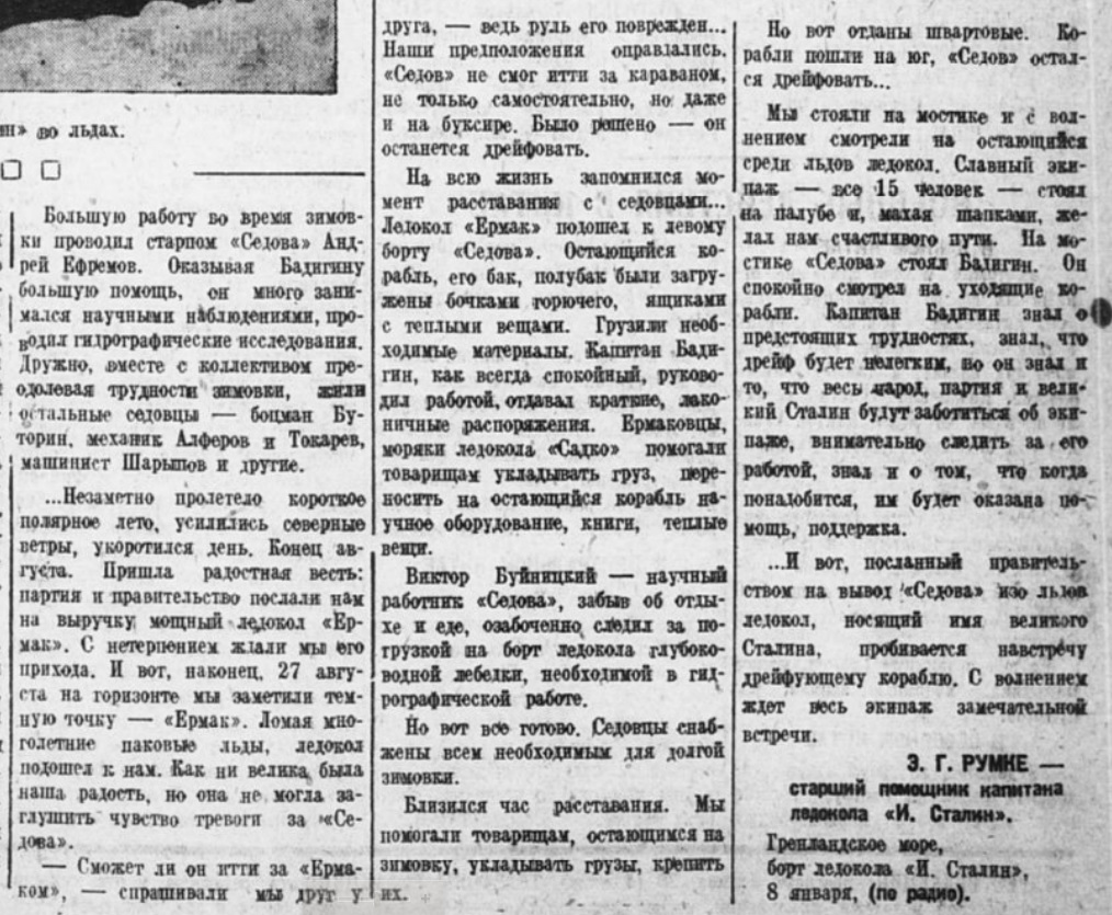 С именем Сталина в наших сердцах начала мы трудный путь во льдах суровой Арктики. Это имя было для нас немеркнущим светочем во все дни ледового дрейфа. Ни ледовые сжатия, ни свирепая пурга, ни жестокие морозы не поколебали нашу волю. Поддержка всего советского народа и родного вождя товарища Сталина, ясность цели, дружная, самоотверженная работа всего коллектива седовцев обеспечили победу, успешное завершение научных работ, сохранение экипажа и корабля. Возвращаясь в родную Москву, от всего экипажа горячо приветствую стахановцев, передовиков производства, весь многотысячный коллектив рабочих и служащих автозавода имени Сталина и призываю их к борьбе за новые достижения». (ТАСС).