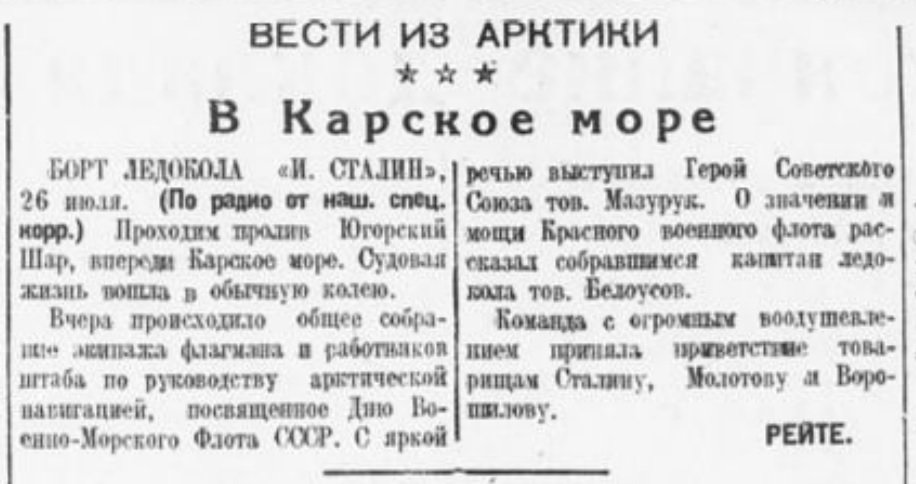 23 октября на Балтийском заводе состоялась в торжественной обстановке закладка двух ледоколов „Иосиф Сталин“ и „Вячеслав Молотов". Первый должен быть закончен к 1 декабря 1936 г., второй — к марту 1937 г. На каждом ледоколе будут находиться гидробиологическая и гидротехническая лаборатории, специальная чертежная и фотолаборатория. Для разведки каждый ледокол будет иметь на борту по два самолета и катапульту для их пуска в полет без аэродрома.