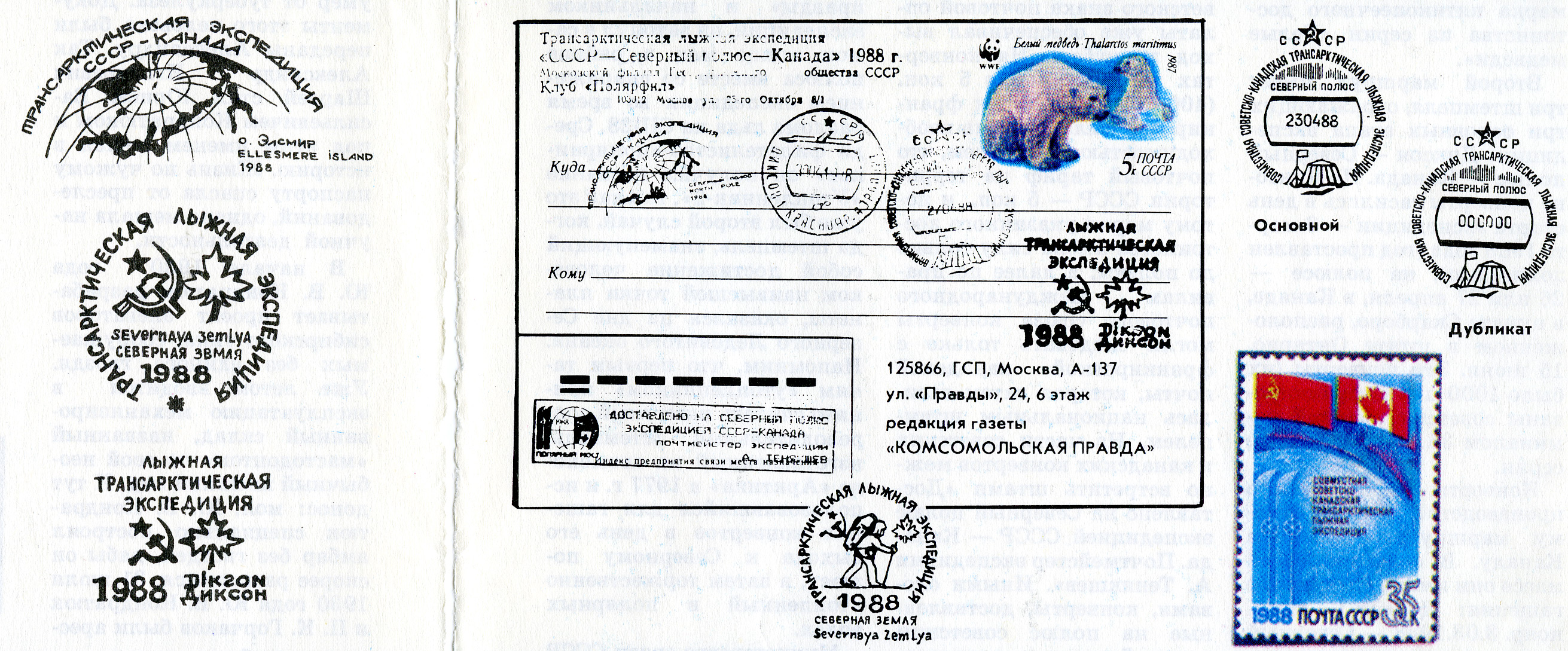 Советской стороной подготовлено и передано экспедиции около 1500 служебных конвертов «Комсомольской правды» стандартного для СССР размера, двух типов (с трафаретной сеткой для почтового индекса и без нее). На них была сделана надпечатка следующего содержания: «Трансарктическая лыжная экспедиция «СССР — Северный полюс — Канада». 1988 г. Московский филиал Географического общества СССР. Клуб «Полярфил». 103112, Москва, ул. 25 Октября, 8/1» (после завершения экспедиции эти конверты поступили по указанному в надпечатке адресу для рассылки по заявкам филателистов, собирающих полярную тематику).