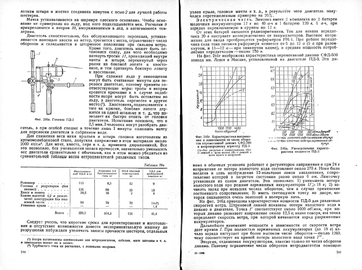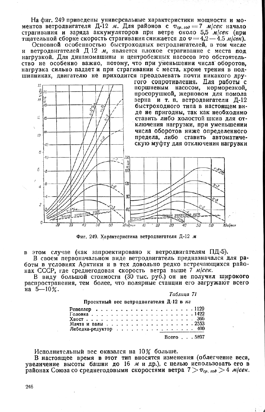 Машина была запроектирована для условий Арктики. Ветродвигатель Д-12 имеет три крыла (фиг. 247), каждое по 6 м длиной. Головка ветродвигателя изображена на фиг. 248а. Главный вал ветродвигателя установленный под углом 11°30' к горизонтальной плоскости, вращается на шариковых подшипниках.