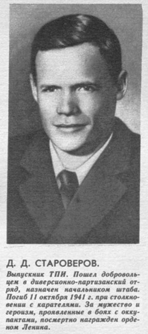 ...Довоенная жизнь Дмитрия Староверова — образец трудового героизма, иначе не скажешь. Коренной томич, сын железнодорожного служащего и учительницы, он в 1930-м году окончил школу II ступени и сразу поступил в Томский политехнический (тогда он назывался Сибирский технологический) институт. Через пять лет получил диплом инженера-гидрогеолога и по этой романтической специальности два года проработал в Кузбассе. Потом был призван в РККА, а в 38-м, отслужив, приехал в Москву. Столица встречала победителей Арктики папанинцев. Молодой инженер пошел устраиваться в Главсевморпуть. В успехе можно было не сомневаться: прекрасное спортивное прошлое и настоящее, специальность по профилю, двухлетний стаж. Его, конечно, приняли. Уже в июне Дмитрий отправился с экспедицией на Чукотку, в бухту Угольную. Сохранился снимок: взобравшись на валун, лицом к Ледовитому океану стоит Староверов и салютует из карабина...