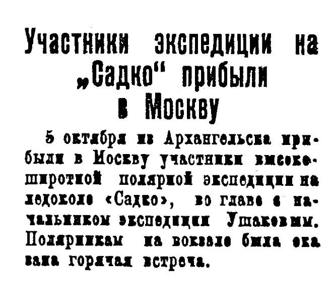 5 октября из Архангельска прибыли в Москву участники высокоширотной полярной экспедиции на пароходе «Садко», во главе в начальником экспедиции Ушаковым. Полярникам на вокзале была оказана горячая встреча.