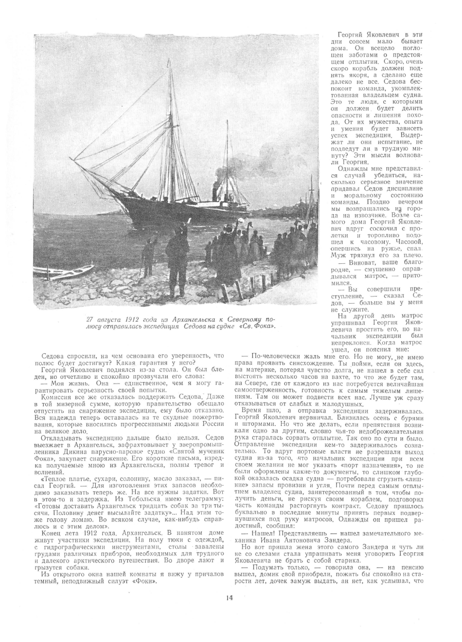 20 сентября экспедиция вынуждена была зазимовать около Панкратьевых островов находящихся поблизости Новой Земли. После того как пять человек из состава экспедиции под командой капитана судна «Св. Фока» Захарова вернулись обратно, экспедиция в составе 17 лиц: д-ра Кушакова, геолога Павлова, геолога Визе, художника Пинегина, помощника капитана Сахарова, механика Зандера и матросов двинулась дальше на север. С той поры об экспедиции мы не имели ни одной вести. Сегодня д-р Кушаков телеграфирует, что во время второй зимовки экспедиции. бывшей у острова Гуккера, принадлежащего к группе островов земли Франца-Иосифа, умер механик Зандер, а руководитель экспедиции Г.Я.Седов на пути к северному полюсу заболел и скончался у острова Рудольфа, где и похоронен бывшими с ним матросами. Вечная ему память!