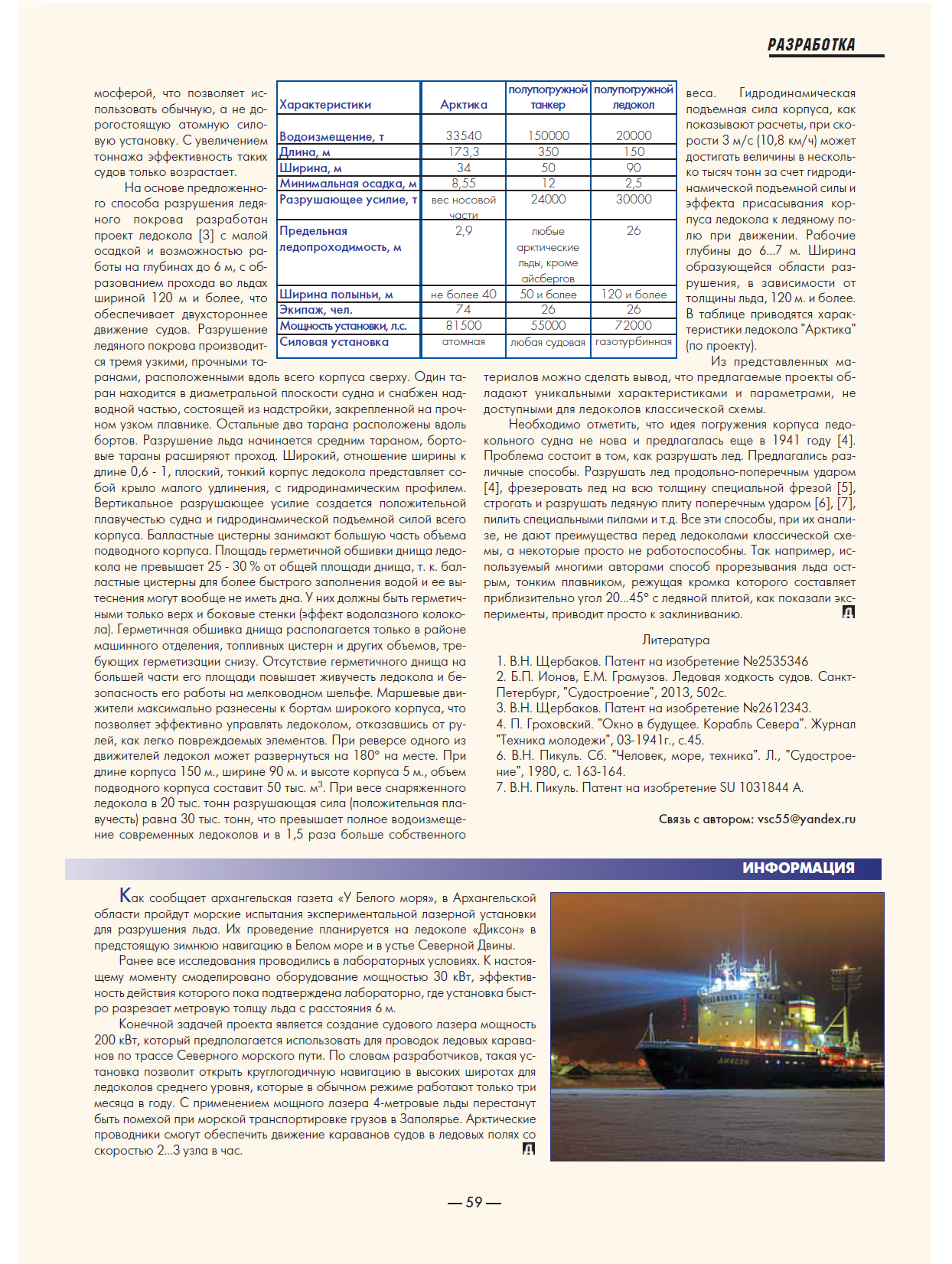 Описанный выше корабль не существует. Однако в будущем он возможен. Интересное зрелище представит такое судно, совершающее рейс во льдах Советской Арктики. Возвышаясь над ледяными полями, скользит, слегка покачиваясь, ярко освещенная рубка. Густой дым валит из широких труб. Мощный прожектор, рассеивая мрак полярной ночи, освещает путь кораблю. А если нужно произвести разведку лежащей впереди «местности», нет ли там непроходимых торосов и ледяных гор, которые следует обойти, с катапульты срывается самолет, чтобы выполнить эту задачу.