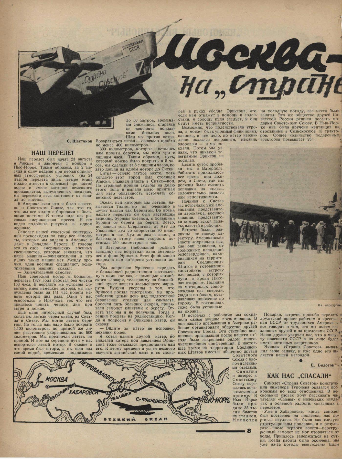 Командир корабля С. А. Шестаков, второй пилот Ф. Е. Болотов, штурман Б. В. Стерлигов и бортмеханик Д. В. Фуфаев пролетели по маршруту Москва – Челябинск – Новосибирск – Красноярск – Иркутск – Чита – Благовещенск – Хабаровск – Николаевск-на-Амуре – Петропавловск-Камчатский – Атту – Уналакша – Сьюярд – Ситка – Ватерфолл – Сиэтл – Окленд – Сан-Франциско – Чикаго – Детройт – Нью-Йорк. Расстояние в 21 242 км было преодолено при крайне неблагоприятных погодных условиях (туманы на маршруте чередовались с бурями и штормами) за 141 ч. 53 мин. лётного времени. В Хабаровске была произведена смена колёсного шасси на поплавки, а в Сиэтле – смена поплавков на колёса. 8 000 км над океаном были пройдены за 50 ч. 30 мин. Встреча в США 30 октября 1929 года была триумфальной.