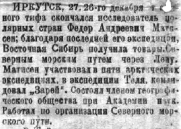 Вчера телеграф принес печальную весть о кончине от сыпного тифа 26 декабря в Иркутске Федора Андреевича Матисен, одного из пионеров на поприще изыскания новых Северных Морских путей между Сибирью и внешним миром.