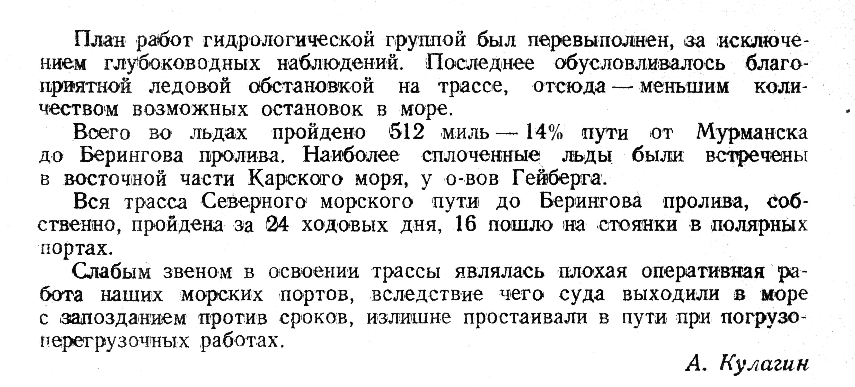 Слабым звеном в освоении трассы являлась плохая оперативная работа наших морских портов, вследствие чего суда выходили в море с запозданием против сроков, излишне простаивали в пути при погрузо-перегрузочных работах.