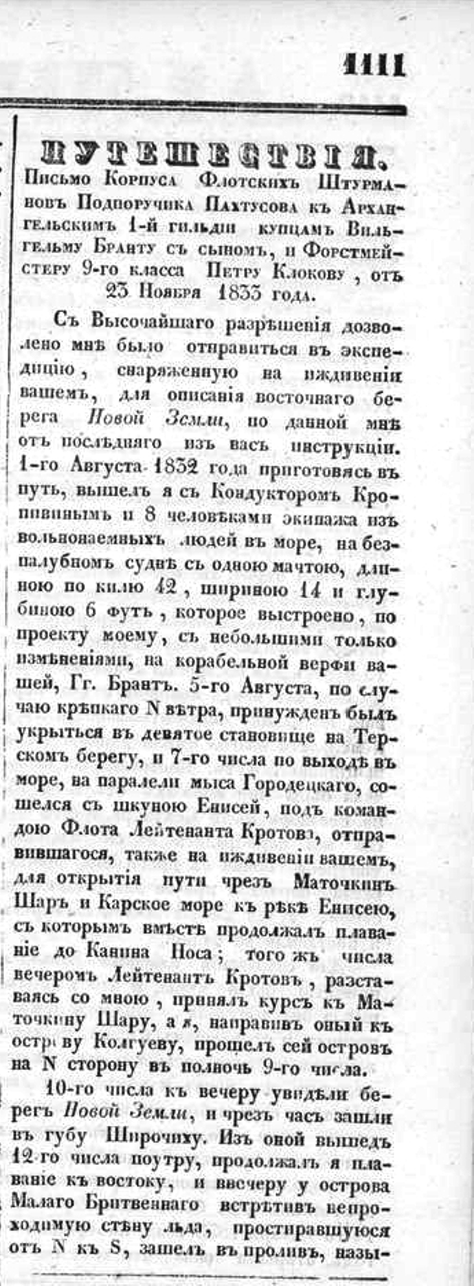 * (Взгляд на Белое море и сведения морской экспедиции Брандта (архангельского 1-й гильдии купца) к восточному берегу Новой Земли, в Карскую губу и устью Енисея. "Журнал мануфактур и торговли", ч. II, № 5, СПб., 1835, стр. 76.)