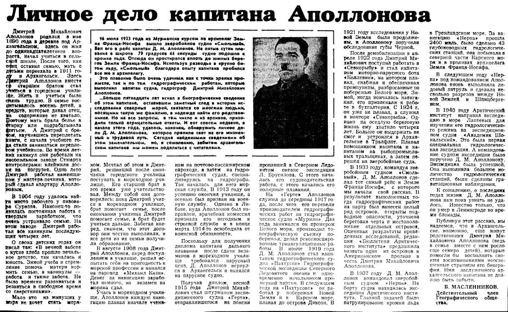 ...Больше пятнадцати лет искал я биографические сведение об этом капитане, оставившем заметный след в истории исследования северных морей, связался со многими людьми, носящими такую же фамилию, в надежде найти его родственников. Но на все запросы, в том числе и из архивов, приходили только отрицательные ответы. И вот совсем недавно, в начале этого года, удалось, наконец, обнаружить личное дело Д. М. Аполлонова, которое пролило свет на его жизненный и трудовой путь. Сегодня найденными сведениями об этом замечательном, но, я сожалению, забытом архангельском капитане мы можем поделиться с читателями.