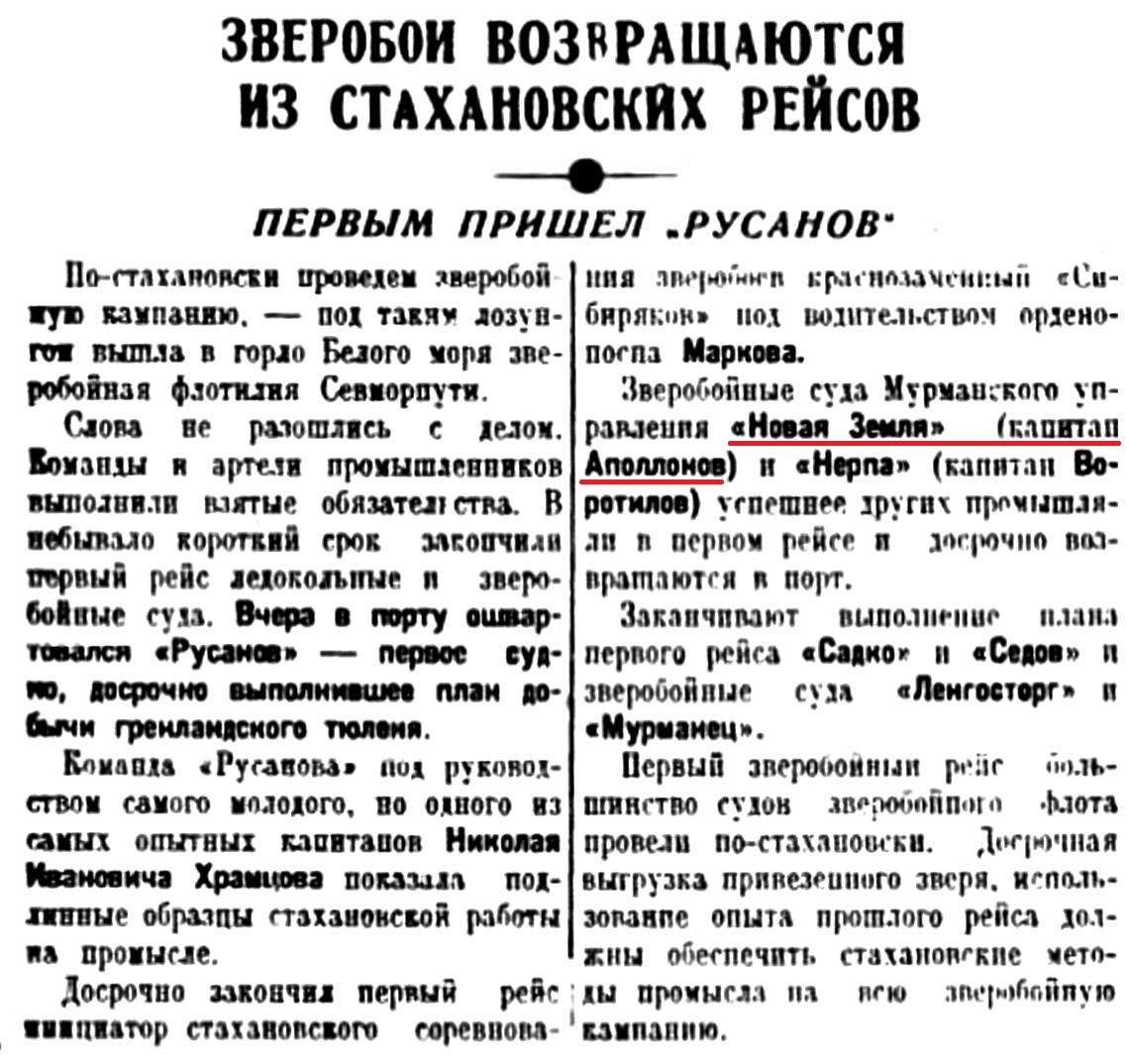 Досрочно закончил первый рейс: инициатор стахановского соревнования зверобоев краснознаменный «Сибиряков» под водительством орденоносца Маркова. Зверобойные суда Мурманского управления «Новая Земля» (капитан Аполлонов) и «Нерпа» (капитан Воротилов) успешнее других промышляли в первом рейсе и досрочно возвращаются в порт.