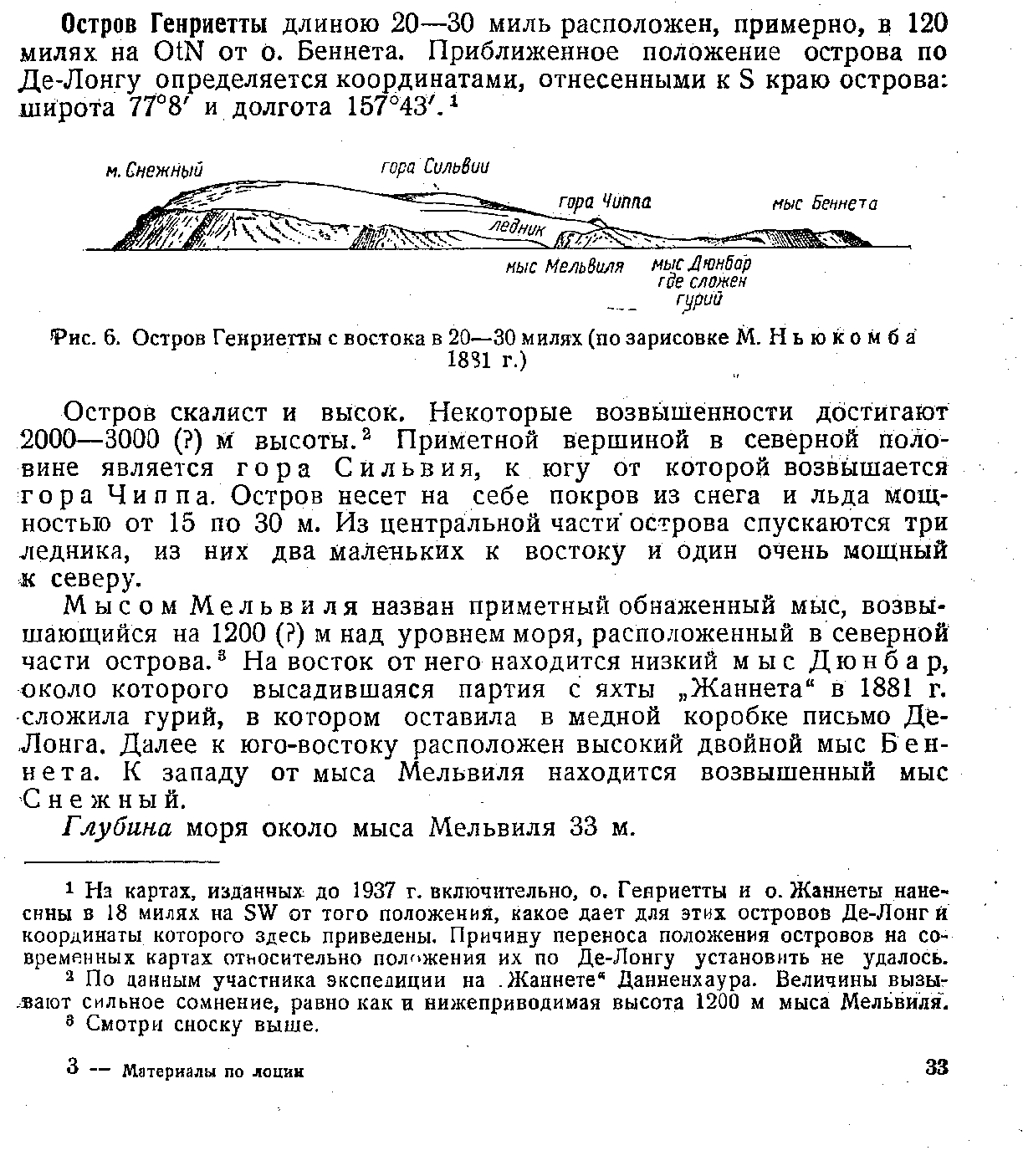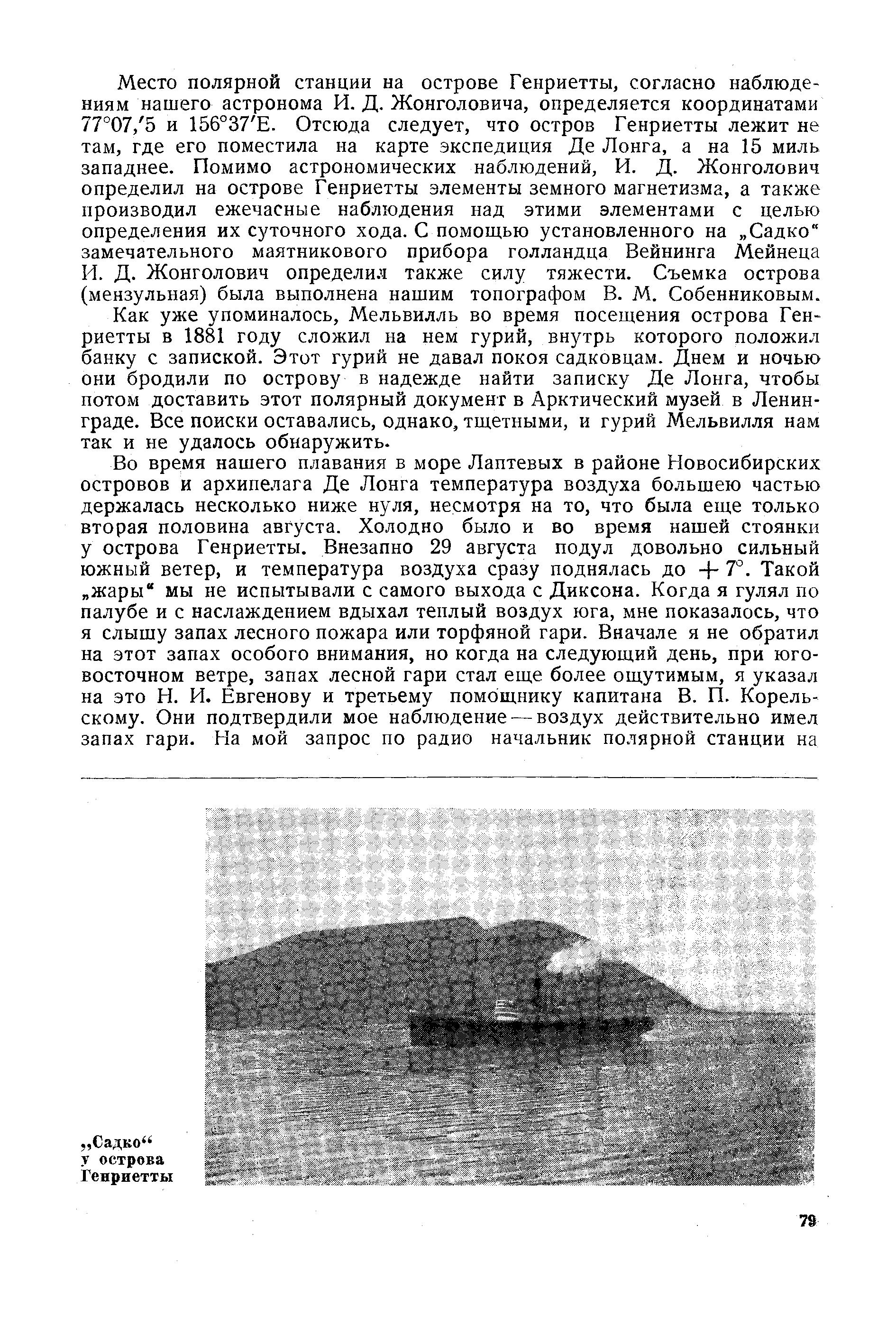 . . . Остров Генриетты открыт экспедицией США под начальством Де-Лонга 25 мая 1881 года. Эта экспедиция отправилась в Арктику в 1879 году на яхте „Жаннета”. В июле 1881 года .Жаннета", раздавленная льдами, погибла. За несколько дней до прихода к острову Генриетты советская экспедиция 1937 года на „Садко* находилась на месте гибели„Жаннеты". В этот момент прозвучала на „Садко" сирена, на грот-мачте взвился государственный флаг СССР. Раздался троекратный винтовочный залп.