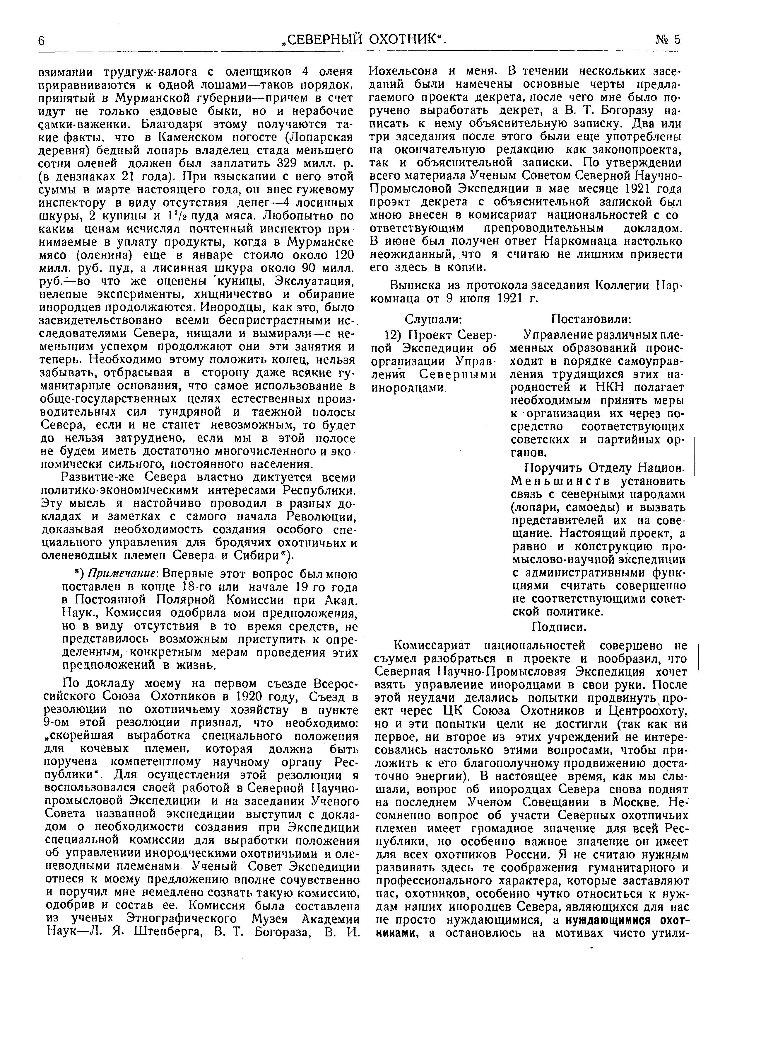 Иохельсона и меня. В течении нескольких заседаний были намечены основные черты предлагаемого проекта декрета, после чего мне было поручено выработать декрет, а В. Т. Богоразу написать к нему объяснительную записку. Два или три заседания после этого были еще употреблены на окончательную редакцию как законопроекта, так и объяснительной записки. По утверждении всего материала Ученым Советом Северной Научно-Промысловой Экспедиции в мае месяце 1921 года проэкт декрета с объяснительной запиской был мною внесен в комиссариат национальностей с соответствующим препроводительным докладом. В июне был получен ответ Наркомнаца настолько неожиданный, что я считаю не лишним привести его здесь в копии.