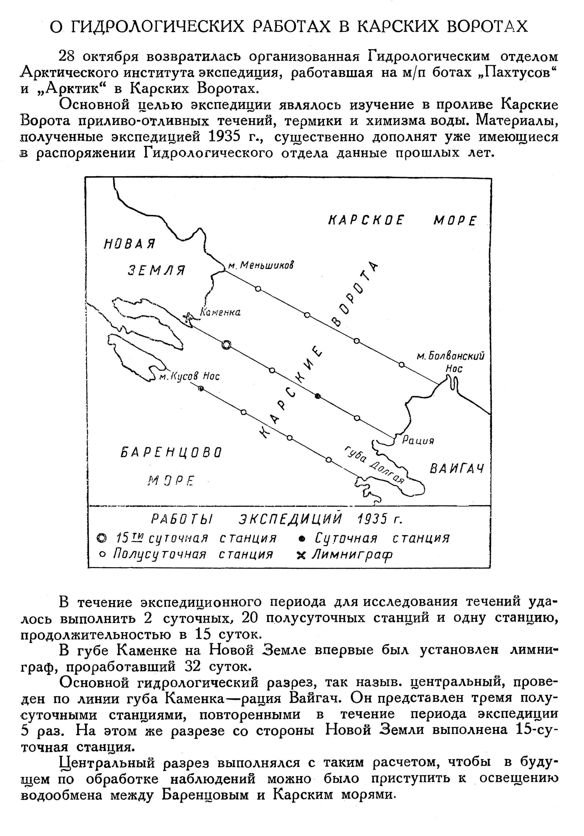 Основной гидрологический разрез, так назыв. центральный, проведен по линии губа Каменка—рация Вайгач. Он представлен тремя полусуточными станциями, повторенными в течение периода экспедиции 5 раз. На этом же разрезе со стороны Новой Земли выполнена 15-су-точная станция.