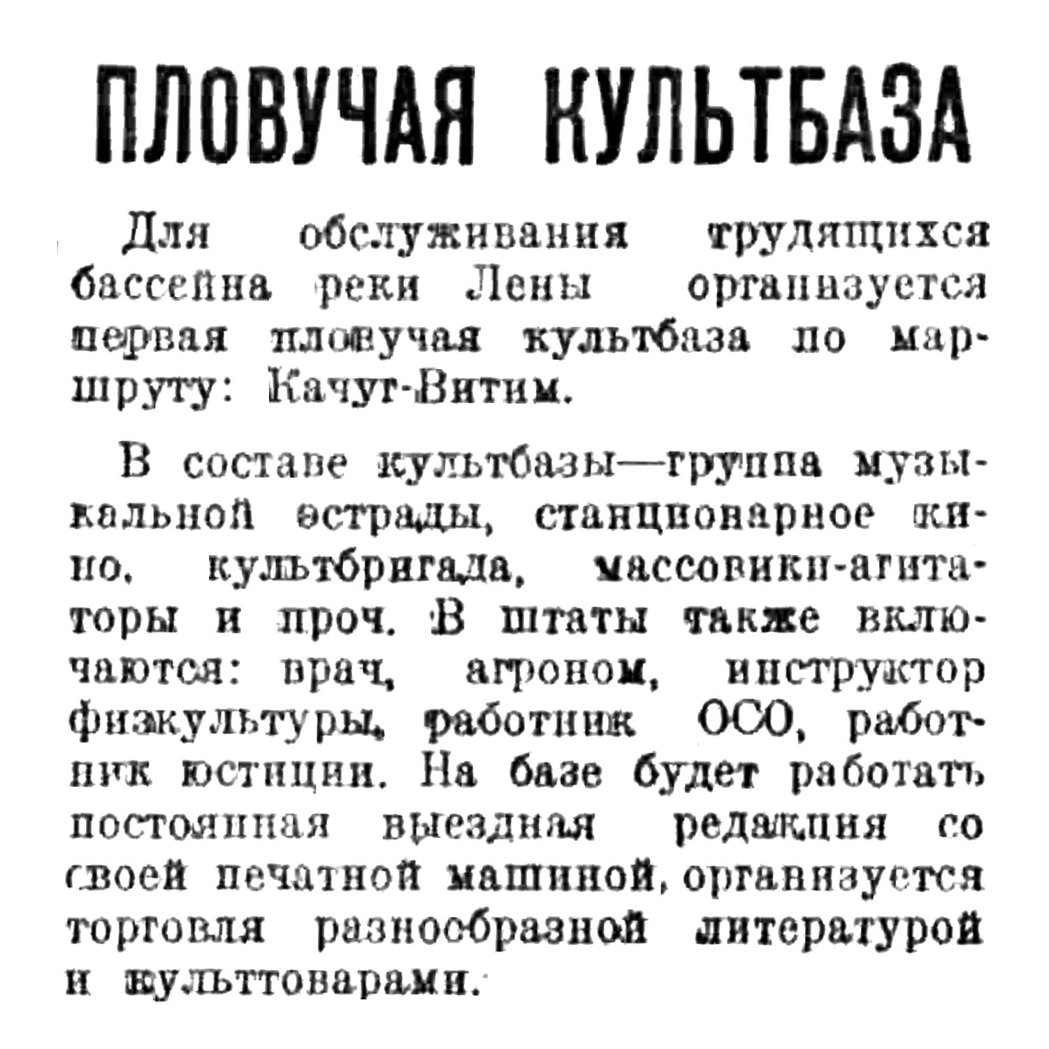 Для обслуживания трудящихся бассейна реки Лены организуется первая пловучая культбаза по маршруту: Качуг-Витим.