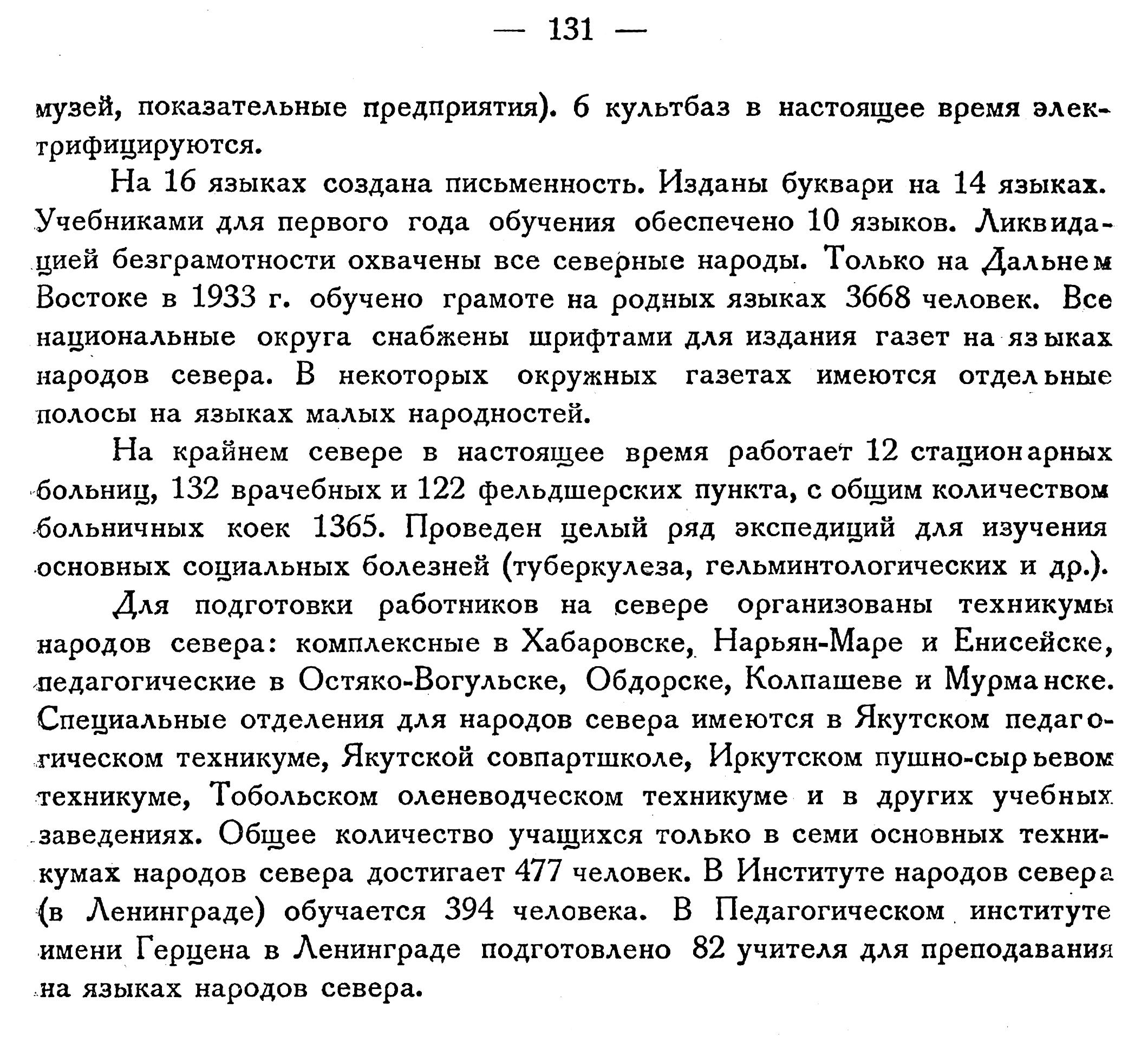 Среди северных народностей, до революции не имевших грамотных, в настоящее время работает 286 школ, охватывающих 55% всех детей школьного возраста. Значительное увеличение количества школ имело место в 1930 г. (до этого года работали только 123 школы, охватывавшие всего 20% детей школьного возраста). В 1933 г. на школьное строительство в северных округах и районах, с населением менее одного миллиона человек, затрачено 2 614 000 рублей.