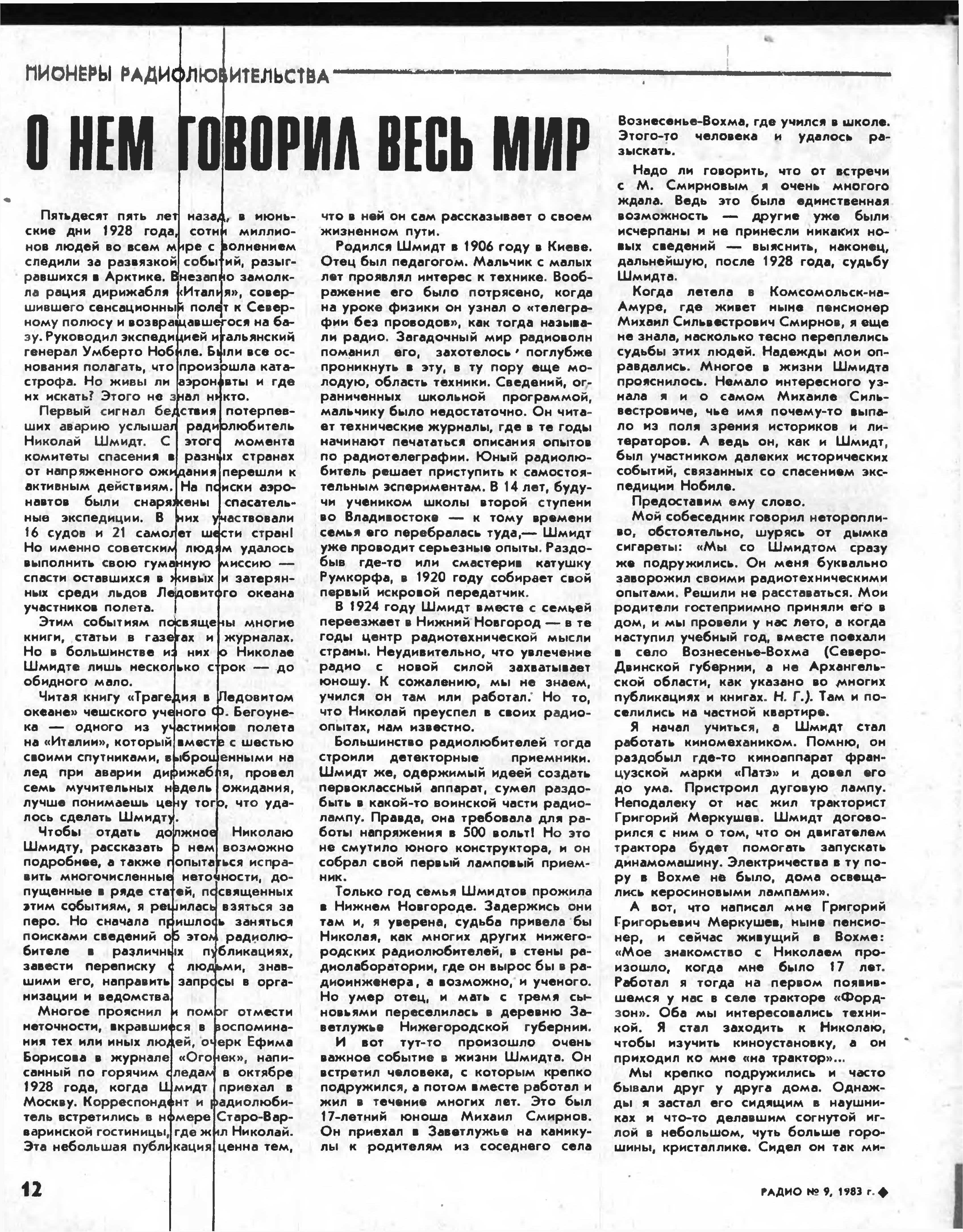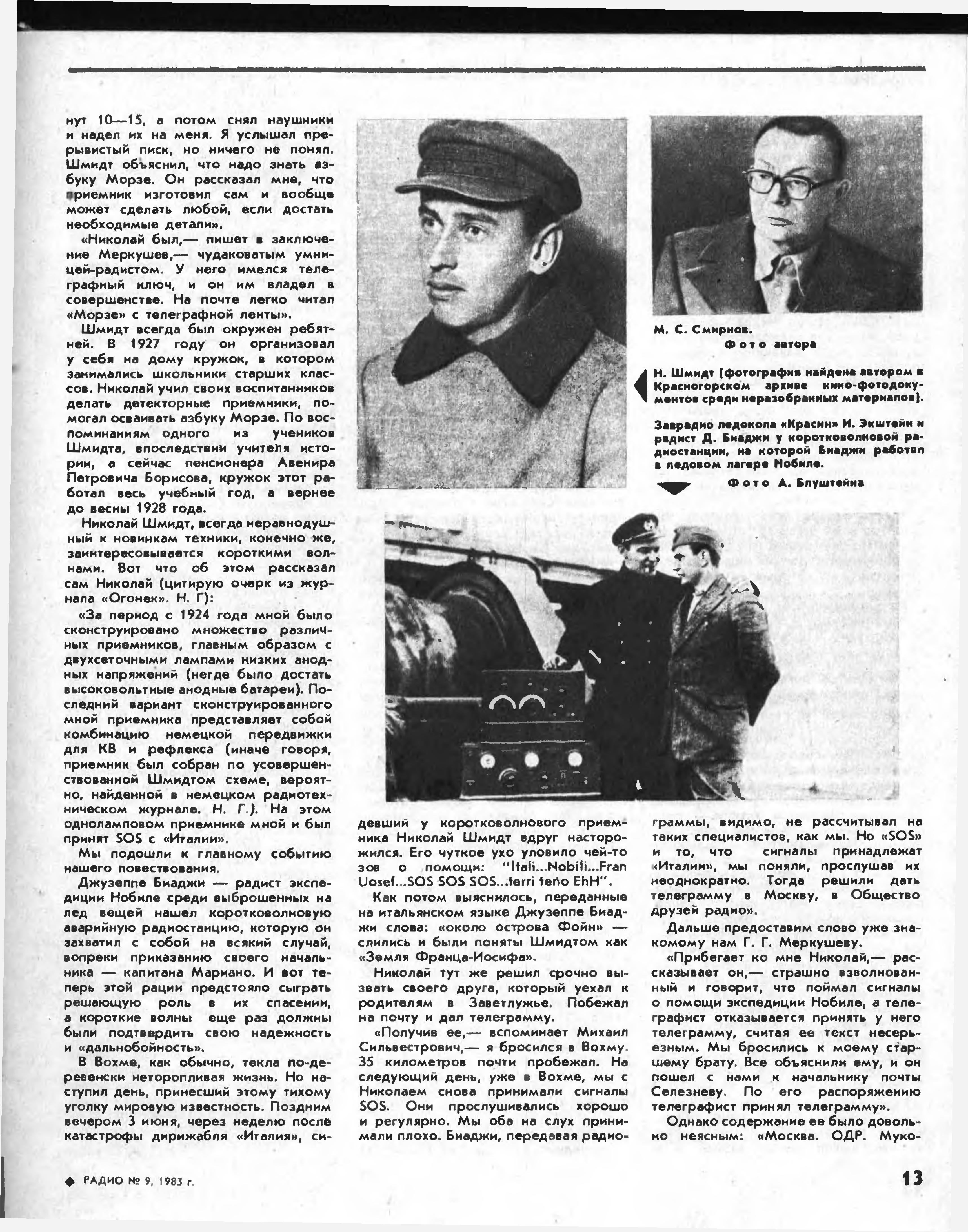 Вечером 3 июня 1928 г.. через неделю после катастрофы дирижабля «Италия», сидевший у коротковолнового приемника Николай Шмидт вдруг насторожился. Сильные атмосферные шумы и замирания мешали приему, но его чуткое ухо уловило чей-то зов о помощи. ««Италия»,.. Нобиле....SOS.. SOS... SOS... терре... тено...» — записал он. Как потом выясни- лось, переданные на итальянском языке Джузеппе Бьяджи слова «около острова Фойн» слились и были поняты Шмидтом, как Земля Франца- Иосифа. (Аналогичную ошибку через несколько дней допустили и радисты на плавучей базе итальянской экспедиции — судне «Читта ди Милано».)