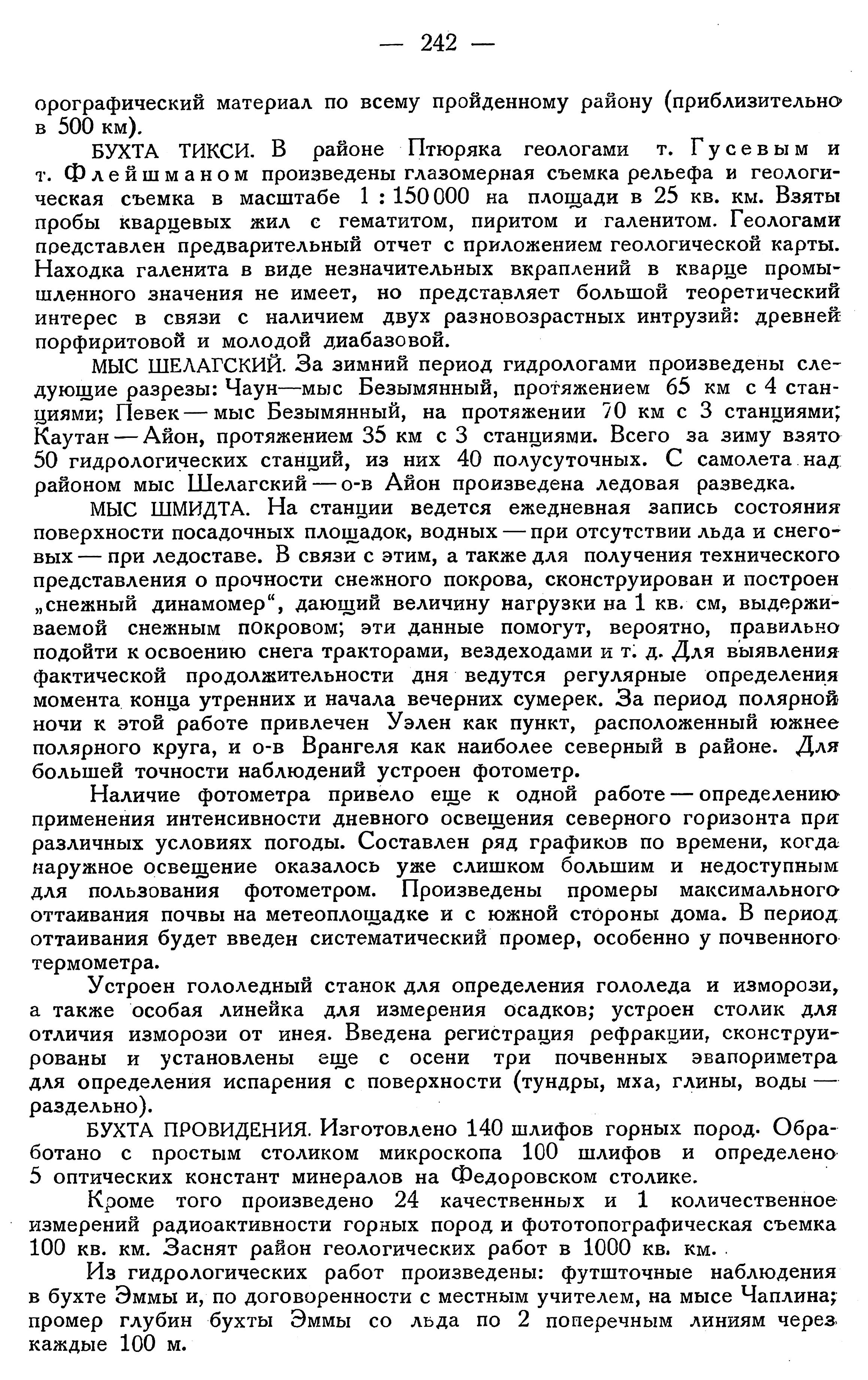 МЫС ШМИДА. Выполнена тридцатидвухсуточная серия ежечасных футшточных наблюдений. В феврале был установлен мареограф, который работал бесперебойно до конца апреля. Произведена съемка и составлены планы трех бухт в районе мыса Шмидта. Промеры в этих бухтах были сделаны еще осенью.
