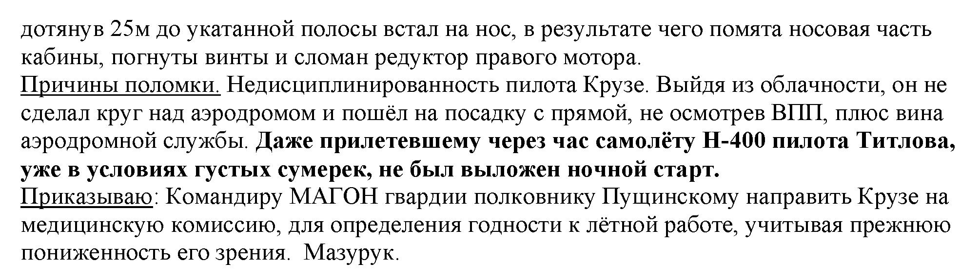 Приказываю: Командиру МАГОН гвардии полковнику Пущинскому направить Крузе на медицинскую комиссию, для определения годности к лётной работе, учитывая прежнюю пониженность его зрения. Мазурук.