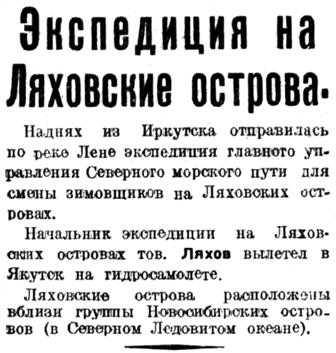 Начальник экспедиции на Ляховских островах тов. Ляхов* вылетел в Якутск на гидросамолете.