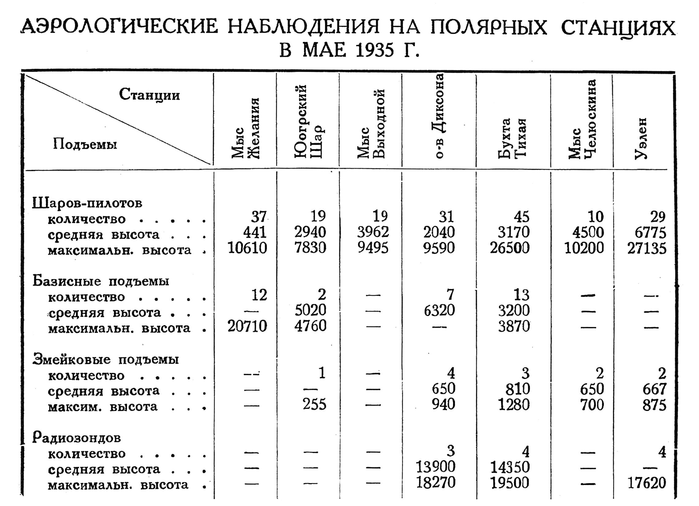 За истекшие шесть лет — с момента выпуска в Слуцке 30 января 1930 г. первого в мире радиозонда — как в Институте аэрологии,так и на многочисленных в настоящее время пунктах в СССР (около 20) и за границей было произведено несколько тысяч таких подъемов. Довольно большая часть этих подъемов (около 300) была произведена в различных пунктах Арктики,главным образом в пределах Советского Союза.