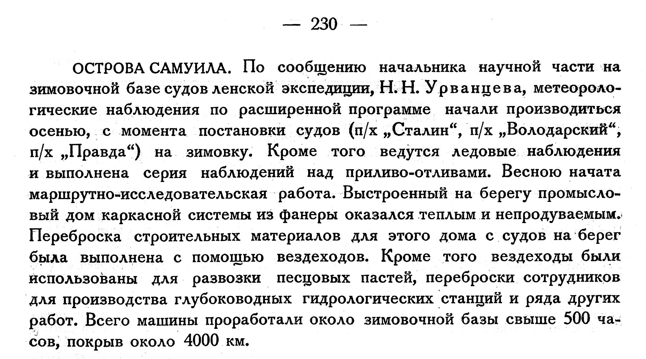 Во время плавания „Красина" сотрудниками Всесоюзного Арктического института были выполнены следующие гидрологические работы:взято 16 глубоководных станций с 200 определений температуры и солености на глубинах и 100 определений содержания кислорода. На глубоководных станциях определялись щелочной резерв и pH, и брались пробы для анализа на содержание нитратов. Поверхностных температур и соленостей взято 250, поверхностные сборы также сопровождались определениями щелочного резерва и pH. Все анализы выполнены в судовой гидрохимической лаборатории. Сделано 100 ледовых обсерваций и 70 инструментальных определений течений на различных глубинах. Выброшено 100 буйков для определения течений, из них часть выброшена на лед. Кроме изложенного, собран значительный материал по параллельному определению солености электрометрическим, оптическим и химическим методами, а также гидрометром Нансена. Выполнен ряд определений плотности морского льда и наблюдений над скоростью испарения эвапарометром Шулейкина. Метеорологические наблюдения на ледоколе велись по программе метеостанций 2-го разряда. Синоптиками экспедиции выполнен ряд аэрологических наблюдений. Обработка собранных материалов будет производиться текущей зимой в Гидрологическом секторе Всесоюзного Арктического института.