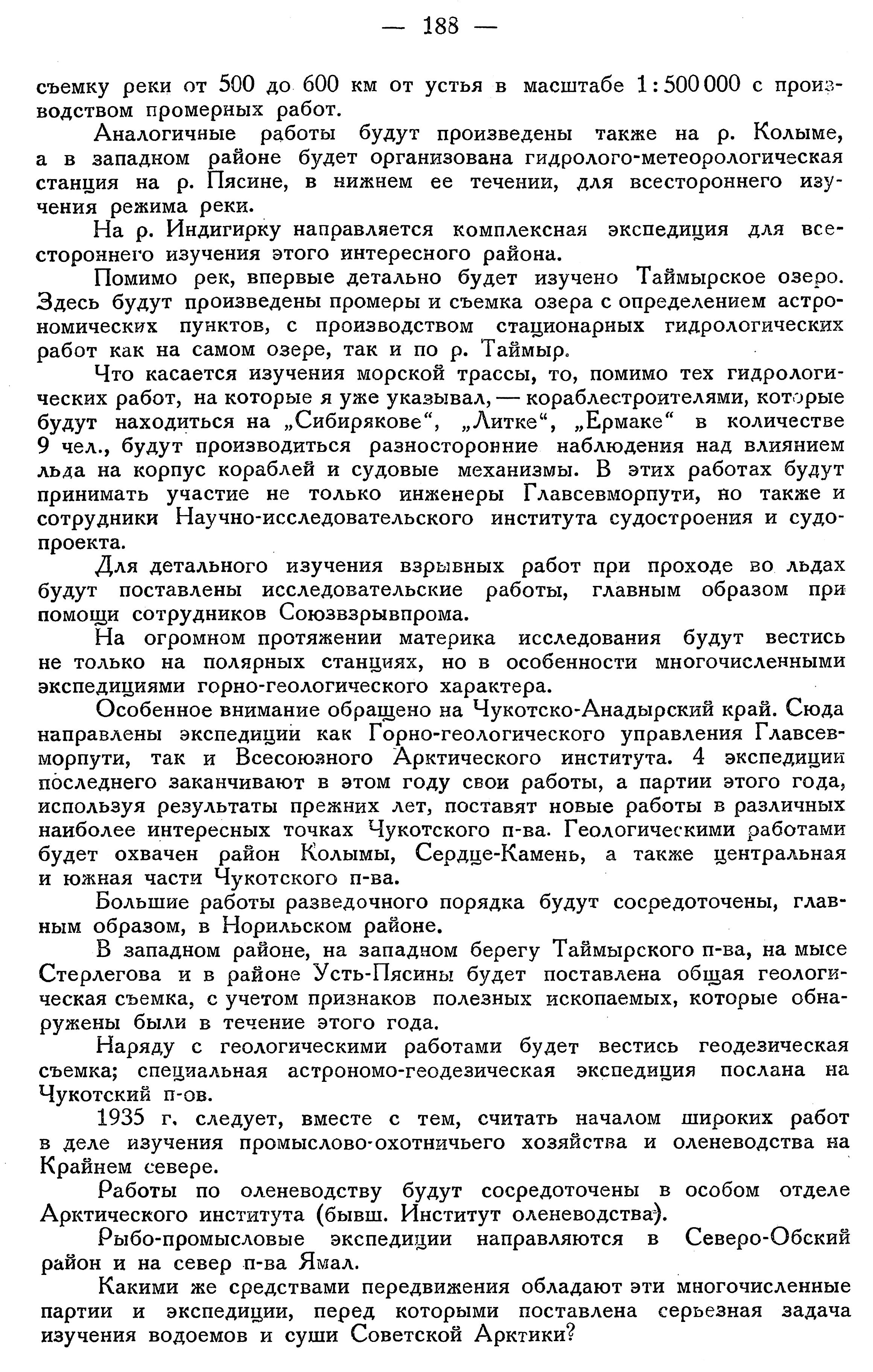 Та большая задача, которая стоит перед Главным управлением Северного морского пути при Совнаркоме СССР, — освоение Северного морского пути, связанное, разумеется, с хозяйственным и экономическим освоением всего района СССР, лежащего севернее 62 параллели, — требует, естественно, серьезной и широкой постановки научных работ в Советской Арктике. Именно из этих соображений в настоящем году будут использованы все органы Главсевморпути для правильной постановки научно-исследовательской деятельности. Не только Всесоюзный Арктический институт, как центральный научно-исследовательский орган Главсевморпути, но также и Полярное управление, Управление воздушной службы, Гидрографическое управление, территориальные управления ставят себе задачей развитие своей деятельности в Советской Арктике на основании точных научных данных.