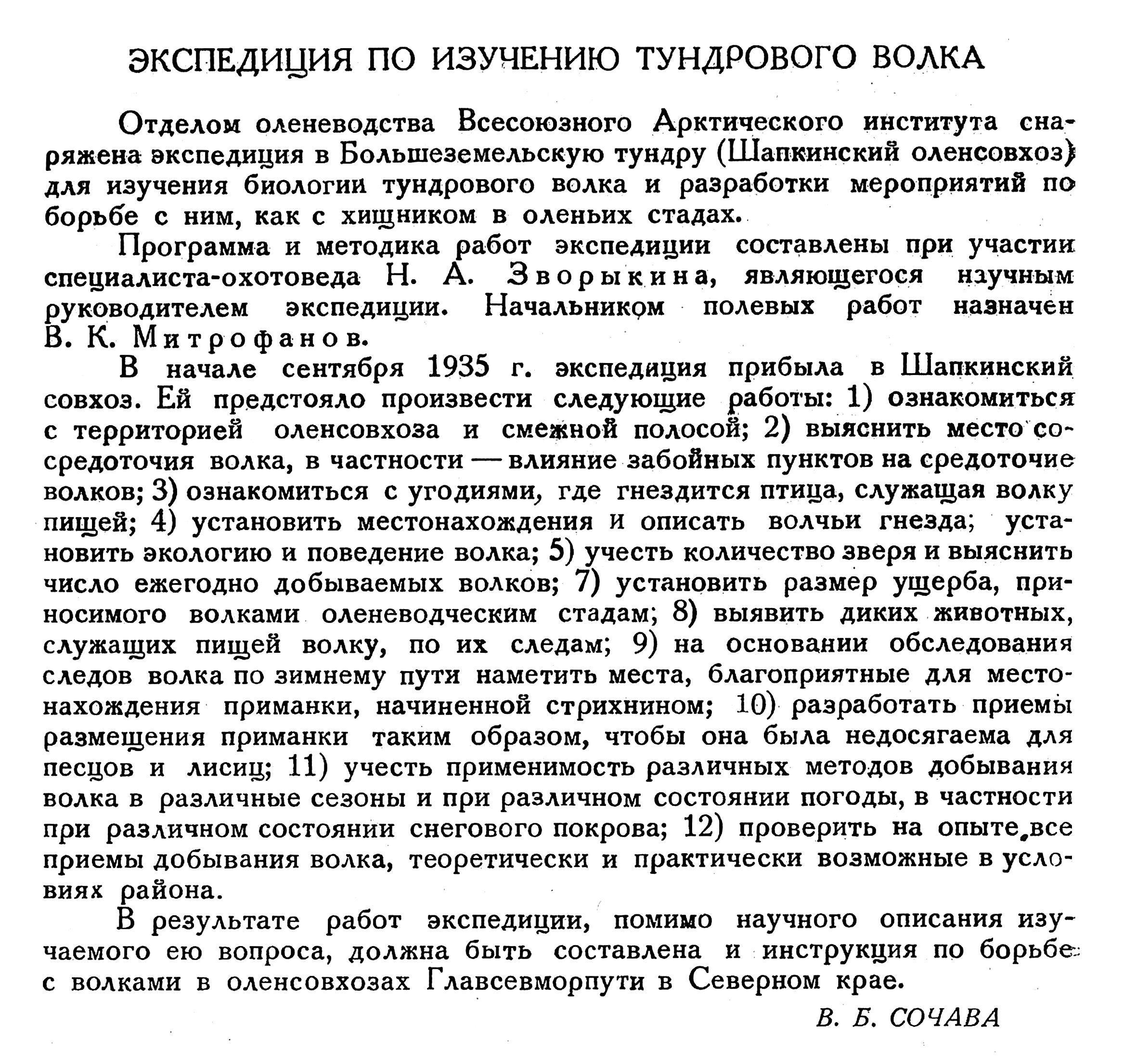 Отделом оленеводства Всесоюзного Арктического института сна­ряжена экспедиция в Большеземельскую тундру (Шапкинский оленсовхоз) для изучения биологий тундрового волка и разработки мероприятий по борьбе с ним, как с хищником в оленьих стадах.