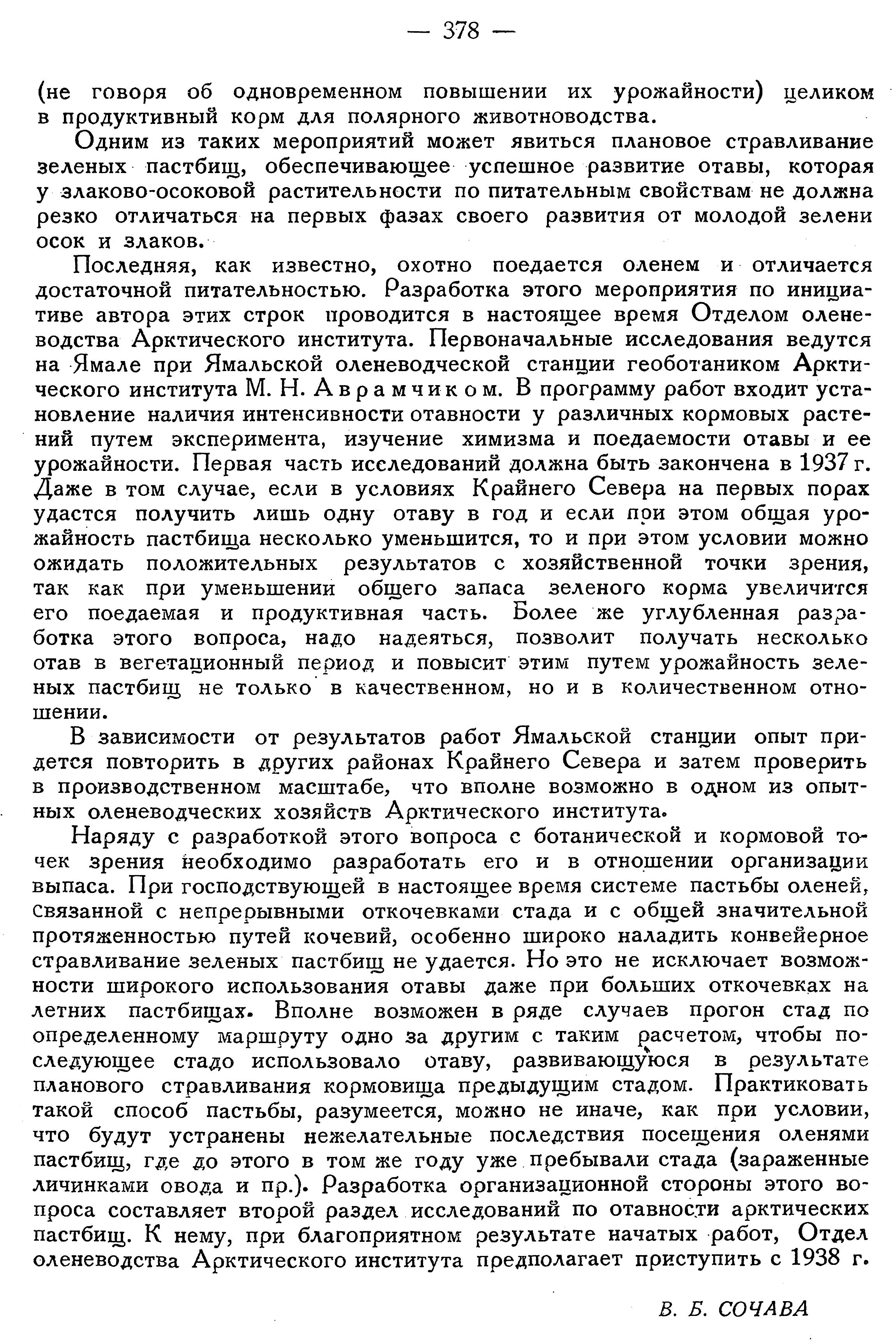 Наряду с разработкой этого вопроса с ботанической и кормовой точек зрения необходимо разработать его и в отношении организации выпаса. При господствующей в настоящее время системе пастьбы оленей, связанной с непрерывными откочевками стада и с общей значительной протяженностью путей кочевий, особенно широко наладить конвейерное стравливание зеленых пастбищ не удается. Но это не исключает возможности широкого использования отавы даже при больших откочевках на летних пастбищах. Вполне возможен в ряде случаев прогон стад по определенному маршруту одно за другим с таким расчетом, чтобы последующее стадо использовало отаву, развивающуюся в результате планового стравливания кормовища предыдущим стадом. Практиковать такой способ пастьбы, разумеется, можно не иначе, как при условии, что будут устранены нежелательные последствия посещения оленями пастбищ, где до этого в том же году уже пребывали стада (зараженные личинками овода и пр.). Разработка организационной стороны этого вопроса составляет второй раздел исследований по отавности арктических пастбищ. К нему, при благоприятном результате начатых работ, Отдел оленеводства Арктического института предполагает приступить с 1938 г.