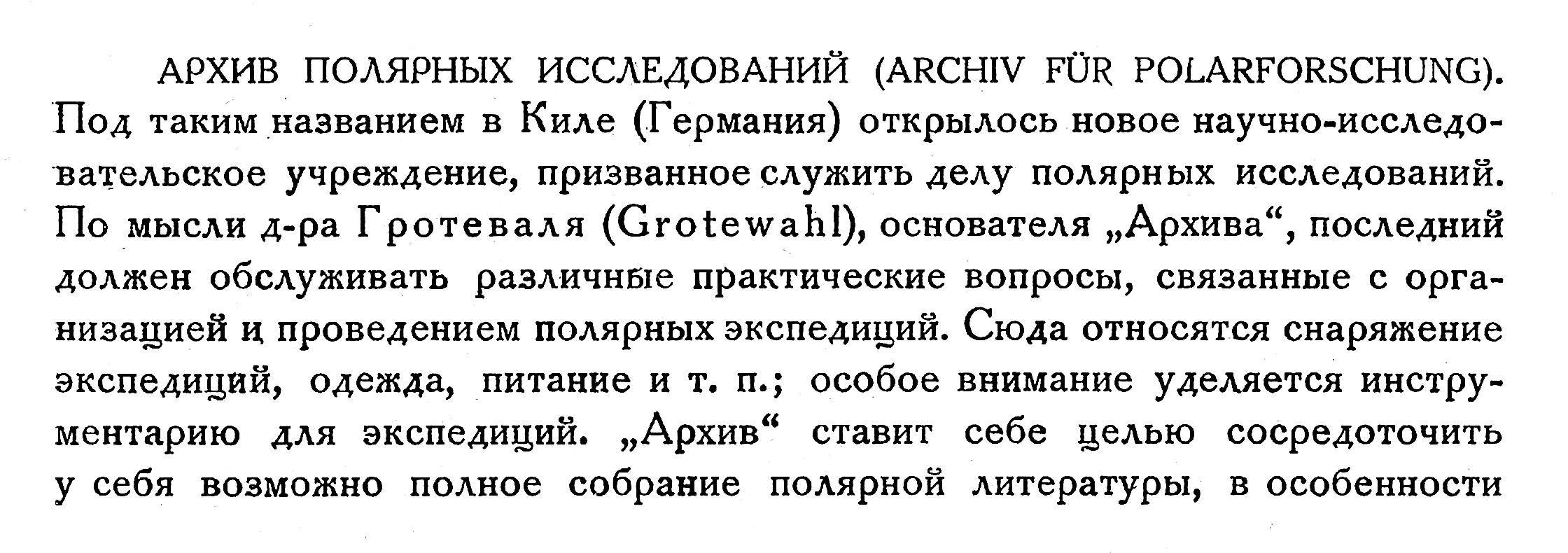 АРХИВ ПОЛЯРНЫХ ИССЛЕДОВАНИЙ (ARCHIV FOR POLARFORSCHUNG). Под таким названием в Киле (Германия) открылось новое научно-исследовательское учреждение, призванное служить делу полярных исследований. По мысли д-ра Гротеваля (Grotewahl), основателя „Архива", последний должен обслуживать различные практические вопросы, связанные с организацией и проведением полярных экспедиций. Сюда относятся снаряжение экспедиций, одежда, питание и т. п.; особое внимание уделяется инструментарию для экспедиций. „Архив* ставит себе целью сосредоточить у себя возможно полное собрание полярной литературы, в особенности