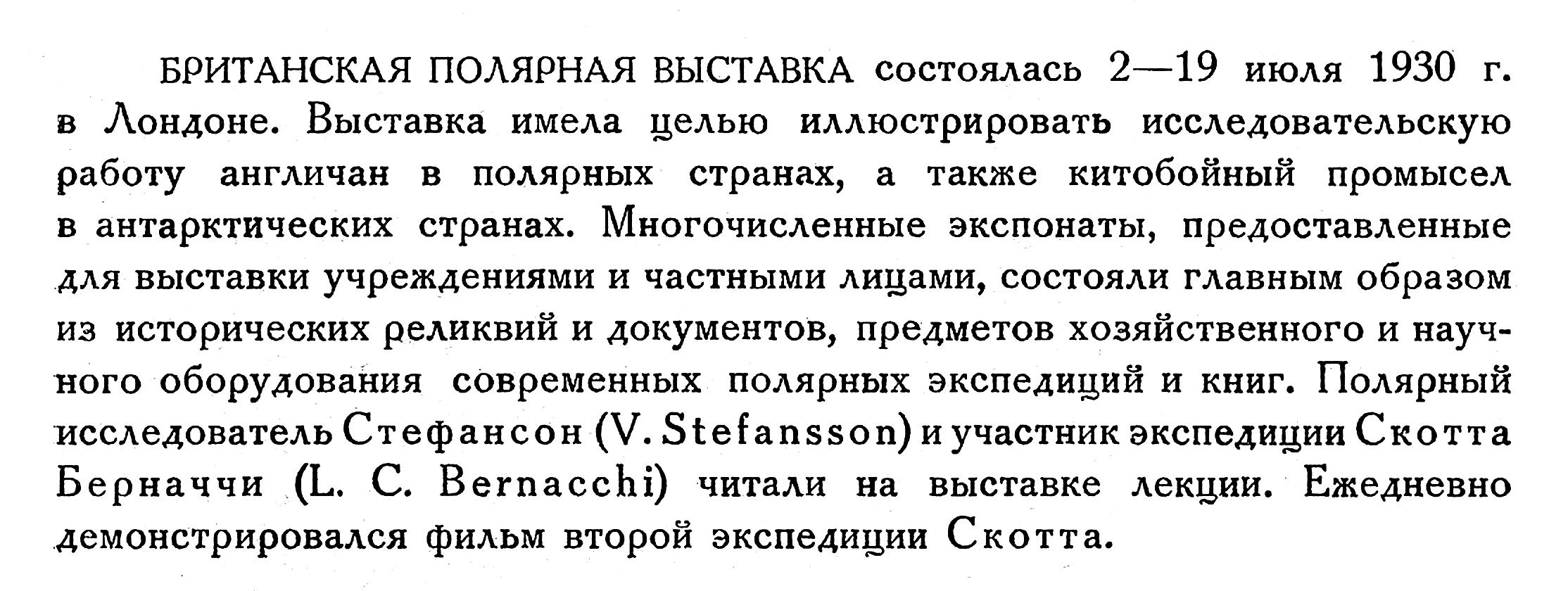 БРИТАНСКАЯ ПОЛЯРНАЯ ВЫСТАВКА состоялась 2—19 июля 1930 г. в Лондоне. Выставка имела целью иллюстрировать исследовательскую работу англичан в полярных странах, а также китобойный промысел в антарктических странах. Многочисленные экспонаты, предоставленные для выставки учреждениями и частными лицами, состояли главным образом из исторических реликвий и документов, предметов хозяйственного и научного оборудования современных полярных экспедиций и книг. Полярный исследователь Стефансон (V. Stefansson) и участник экспедиции Скотта Берначчи (L. С. Bernacchi) читали на выставке лекции. Ежедневно демонстрировался фильм второй экспедиции Скотта.