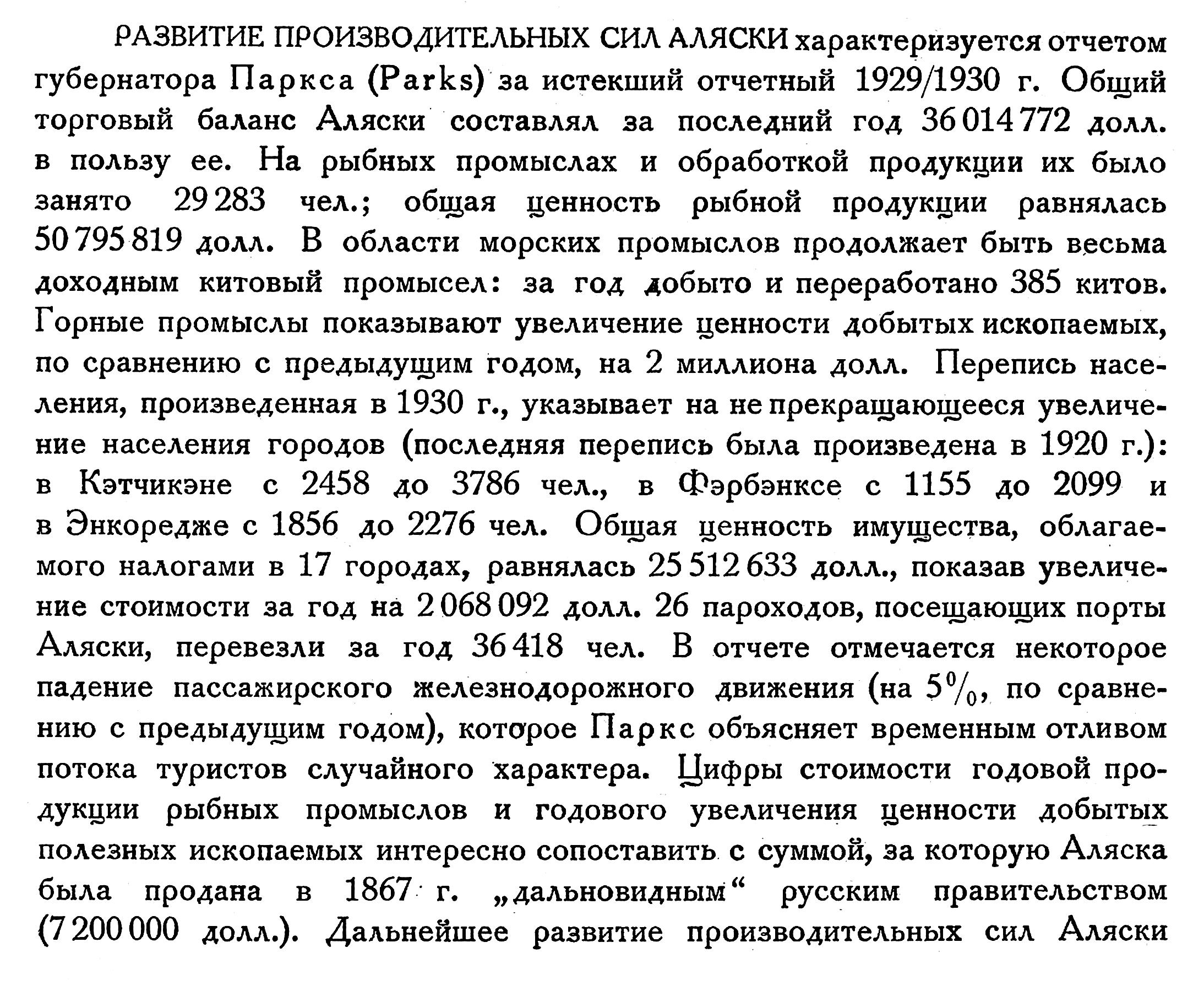 РАЗВИТИЕ ПРОИЗВОДИТЕЛЬНЫХ СИЛ АЛЯСКИ характеризуется отчетом губернатора Паркса (Parks) за истекший отчетный 1929/1930 г. Общий торговый баланс Аляски составлял за последний год 36 014 772 долл. в пользу ее. На рыбных промыслах и обработкой продукции их было занято 29 283 чел.; общая ценность рыбной продукции равнялась 50 795 819 долл. В области морских промыслов продолжает быть весьма доходным китовый промысел: за год добыто и переработано 385 китов. Горные промыслы показывают увеличение ценности добытых ископаемых, по сравнению с предыдущим годом, на 2 миллиона долл. Перепись населения, произведенная в 1930 г., указывает на не прекращающееся увеличение населения городов (последняя перепись была произведена в 1920 г.): в Кэтчикэне с 2458 до 3786 чел., в Фэрбэнксе с 1155 до 2099 и в Энкоредже с 1856 до 2276 чел. Общая ценность имущества, облагаемого налогами в 17 городах, равнялась 25 512 633 долл., показав увеличение стоимости за год на 2 068 092 долл. 26 пароходов, посещающих порты Аляски, перевезли за год 36 418 чел. В отчете отмечается некоторое падение пассажирского железнодорожного движения (на 5%, по сравнению с предыдущим годом), которое Паркс объясняет временным отливом потока туристов случайного характера. Цифры стоимости годовой продукции рыбных промыслов и годового увеличения ценности добытых полезных ископаемых интересно сопоставить с суммой, за которую Аляска была продана в 1867 г. „ дальновидным“ русским правительством (7 200 000 долл.). Дальнейшее развитие производительных сил Аляски