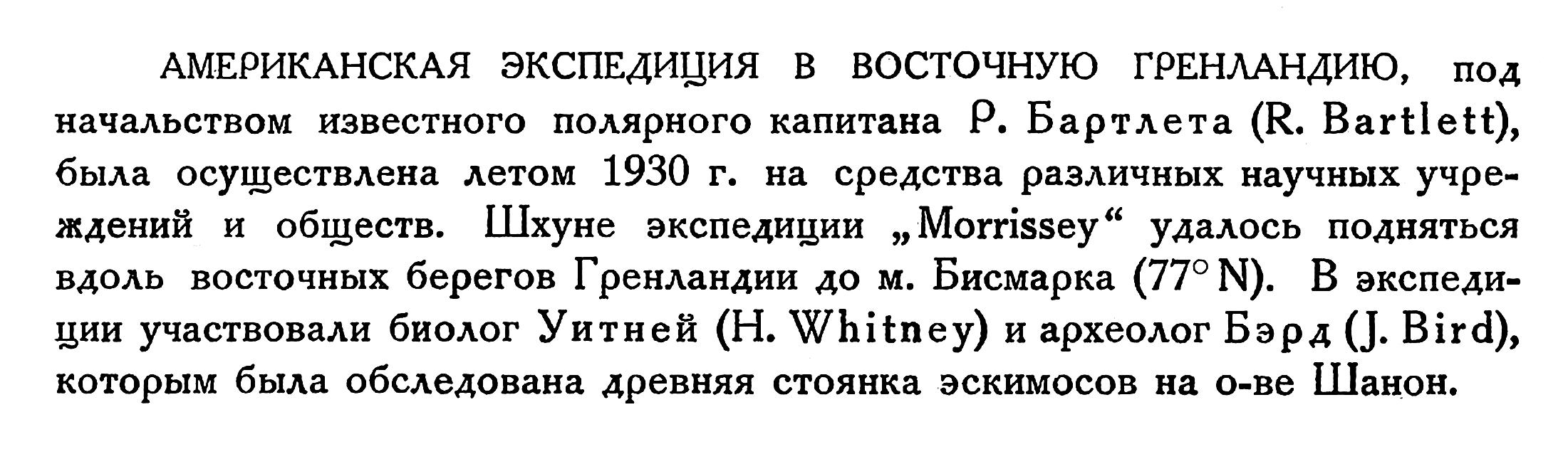 АМЕРИКАНСКАЯ ЭКСПЕДИЦИЯ В ВОСТОЧНУЮ ГРЕНЛАНДИЮ, под начальством известного полярного капитана Р. Бартлета (R. Bartlett), была осуществлена летом 1930 г. на средства различных научных учреждений и обществ. Шхуне экспедиции „Morrissey" удалось подняться вдоль восточных берегов Гренландии до м. Бисмарка (77° N). В экспедиции участвовали биолог Уитней (Н. Whitney) и археолог Бэрд (J. Bird), которым была обследована древняя стоянка эскимосов на о-ве Шанон.