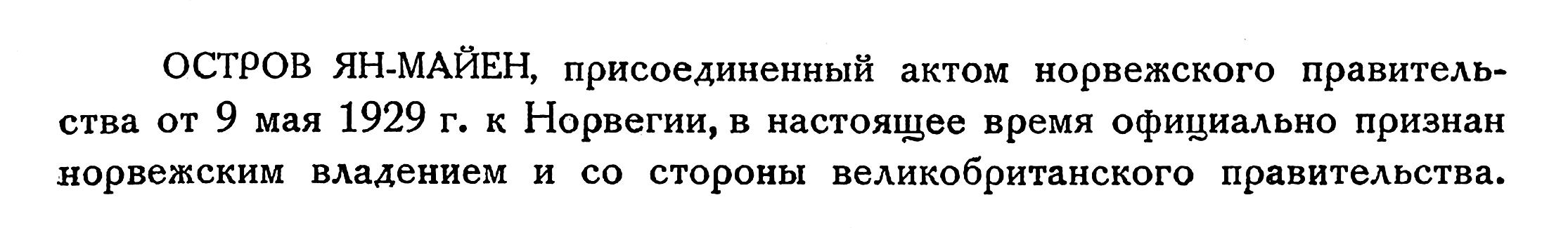 ОСТРОВ ЯН-МАЙЕН, присоединенный актом норвежского правительства от 9 мая 1929 г. к Норвегии, в настоящее время официально признан норвежским владением и со стороны великобританского правительства.