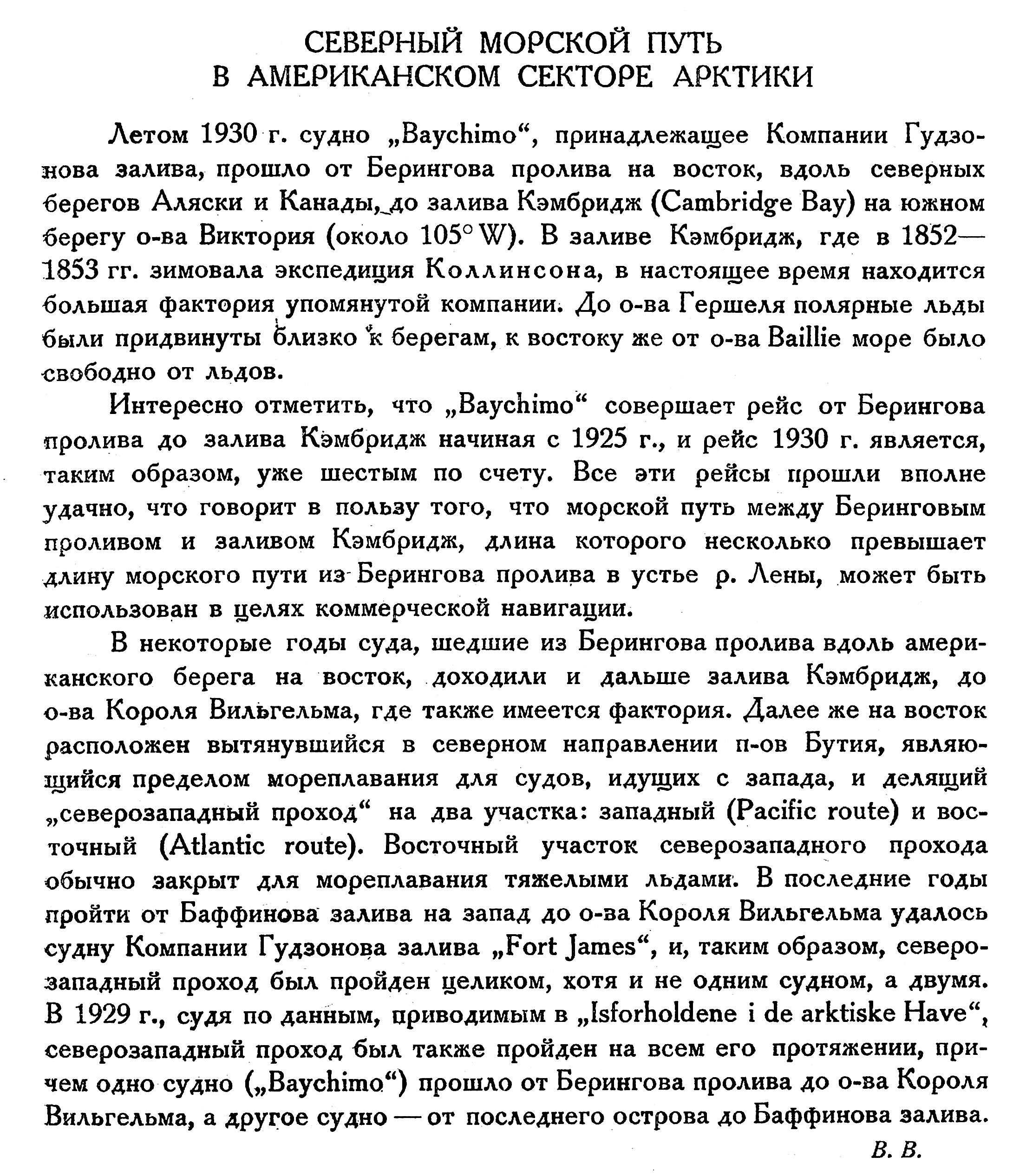 Интересно отметить, что „Baychimo“ совершает рейс от Берингова пролива до залива Кэмбридж начиная с 1925 г., и рейс 1930 г. является, таким образом, уже шестым по счету. Все эти рейсы прошли вполне удачно, что говорит в пользу того, что морской путь между Беринговым проливом и заливом Кэмбридж, длина которого несколько превышает длину морского пути из Берингова пролива в устье р. Лены, может быть использован в целях коммерческой навигации.