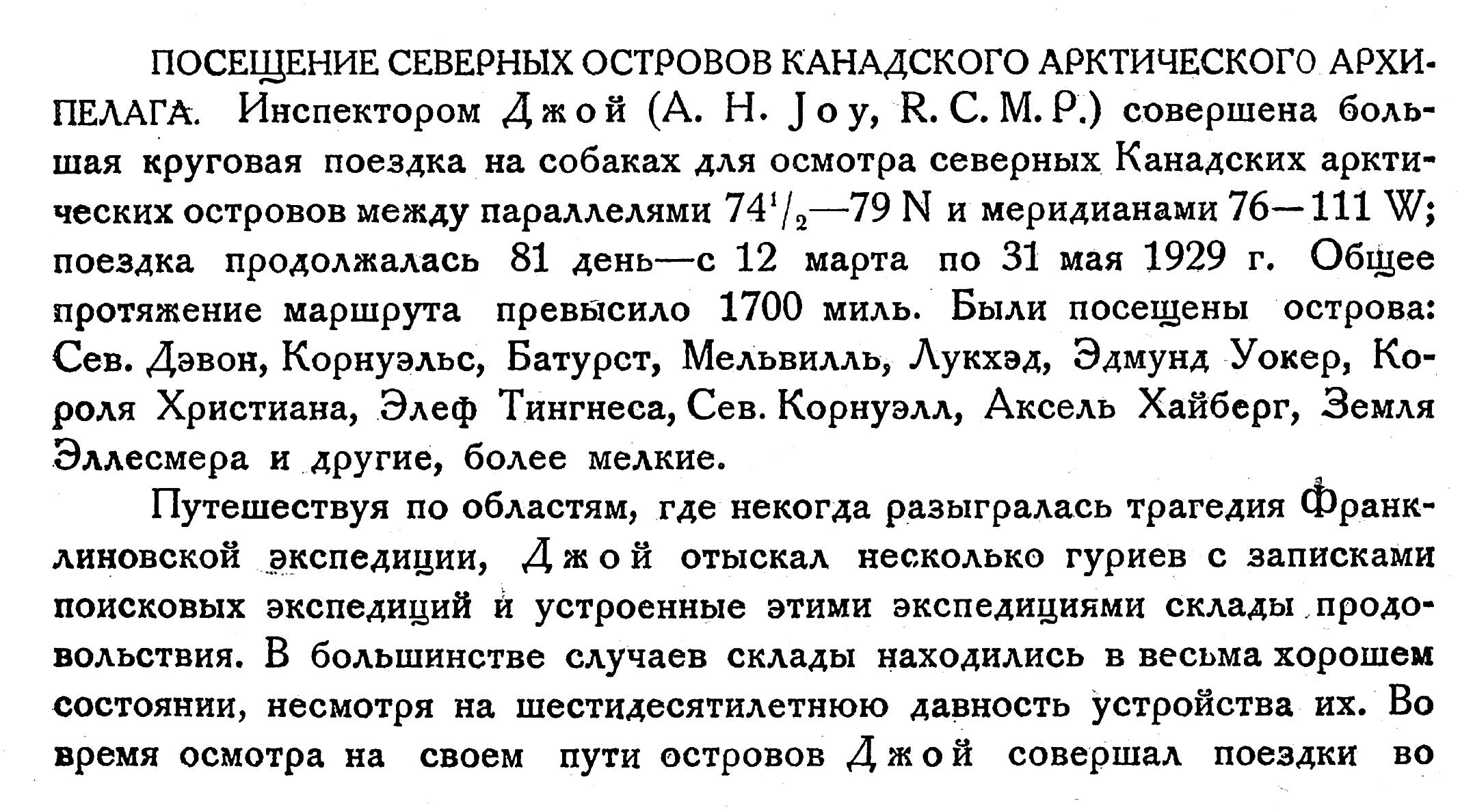 ПОСЕЩЕНИЕ СЕВЕРНЫХ ОСТРОВОВ КАНАДСКОГО АРКТИЧЕСКОГО АРХИПЕЛАГА. Инспектором Джой (А. Н. Jоу, R. С. М. Р.) совершена большая круговая поездка на собаках для осмотра северных Канадских арктических островов между параллелями 74 1/2—79 N и меридианами 76—111 W; поездка продолжалась 81 день — с 12 марта по 31 мая 1929 г. Общее протяжение маршрута превысило 1700 миль. Были посещены острова: Сев. Дэвон, Корнуэльс, Батурст, Мельвилль, Лукхэд, Эдмунд Уокер, Короля Христиана, Элеф Тингнеса, Сев. Корнуэлл, Аксель Хайберг, Земля Эллесмера и другие, более мелкие.