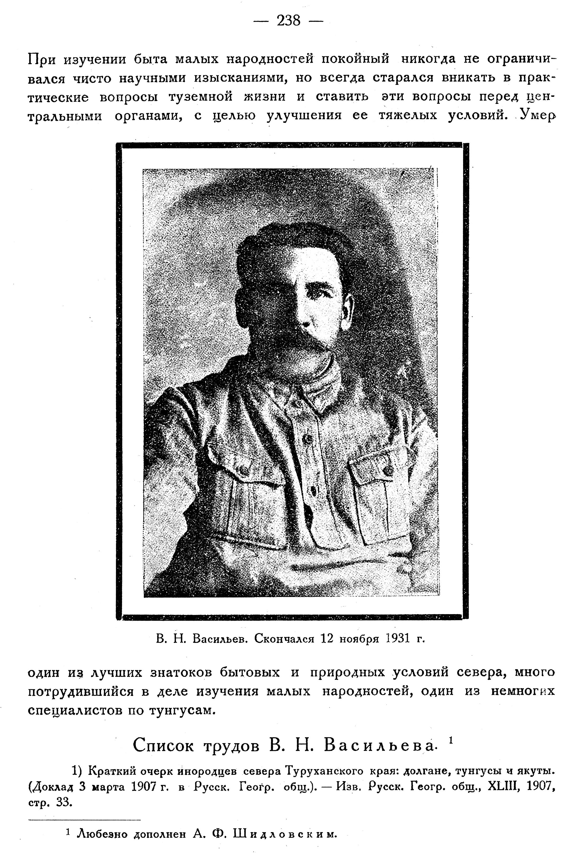 2) Краткий очерк инородцев севера Туруханского края. —Ежегодн. Русск. Антропол. общ., СПб., II, 1905-1907, стр. 362—378; 1908, стр. 56—87; 1909, вып. 1, стр. 90—100. (Текст с предисл. В. Васильева).