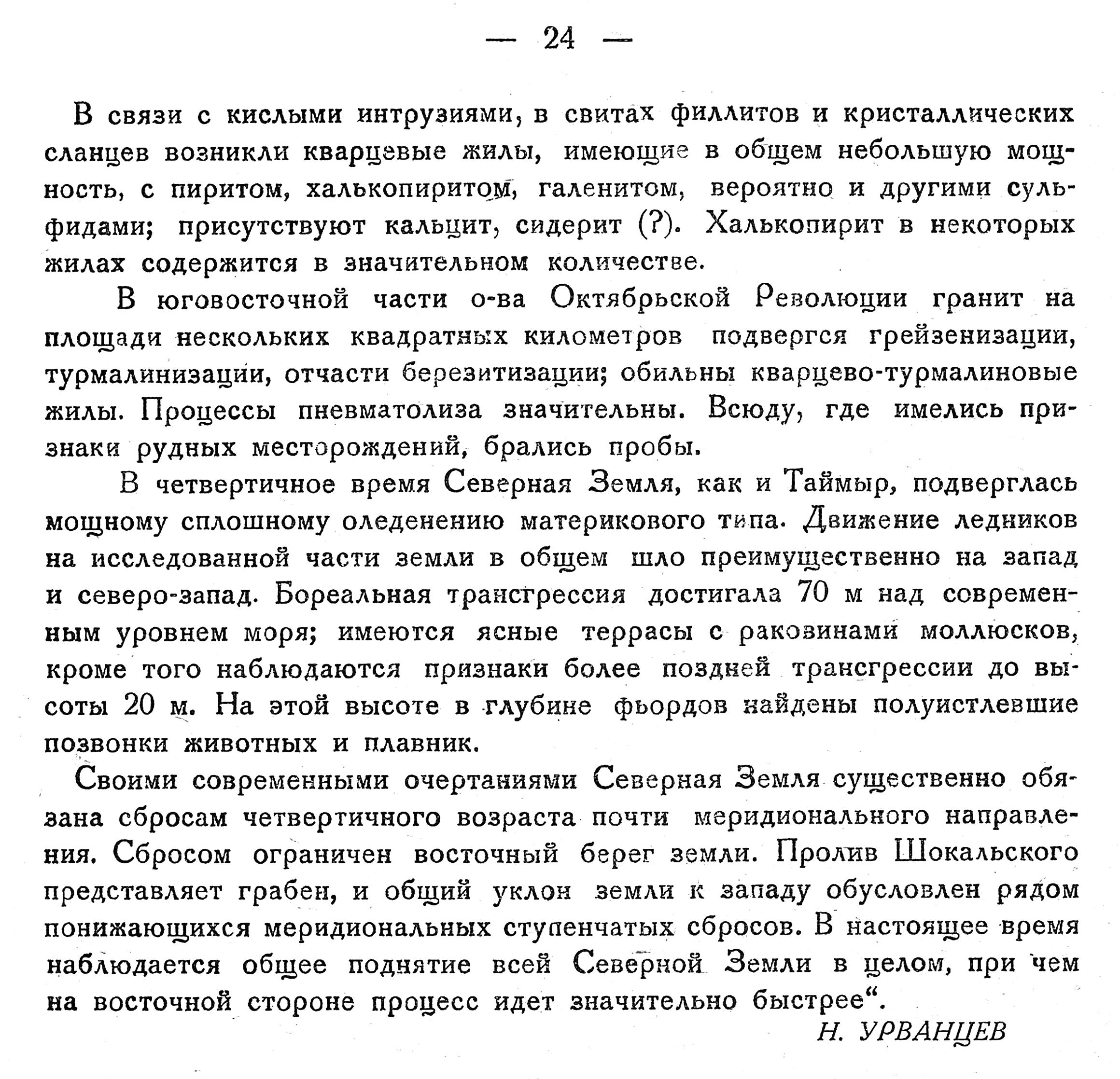 В юговосточиой части о-ва Октябрьской Революции гранит на площади нескольких квадратных километров подвергся грейзенизации, турмалинизации, отчасти березитизации; обильны кварцево-турмалиновые жилы. Процессы пневматолиза значительны. Всюду, где имелись признаки рудных месторождений, брались пробы.