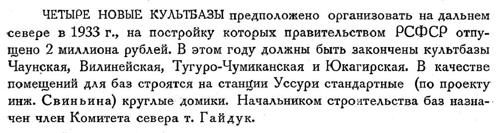 ЧЕТЫРЕ НОВЫЕ КУЛЬТБАЗЫ предположено организовать на дальнем севере в 1933 г., на постройку которых правительством РСФСР отпущено 2 миллиона рублей. В этом году должны быть закончены культбазы Чаунская, Вилинейская, Тугуро-Чумиканская и Юкагирская. В качестве помещений для баз строятся на станции Уссури стандартные (по проекту инж. Свиньина) круглые домики. Начальником строительства баз назначен член Комитета севера т. Гайдук.