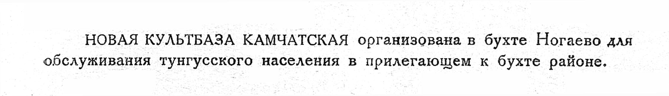 НОВАЯ КУЛЬТБАЗА КАМЧАТСКАЯ организована в бухте Ногаево для обслуживания тунгусского населения в прилегающем к бухте районе.