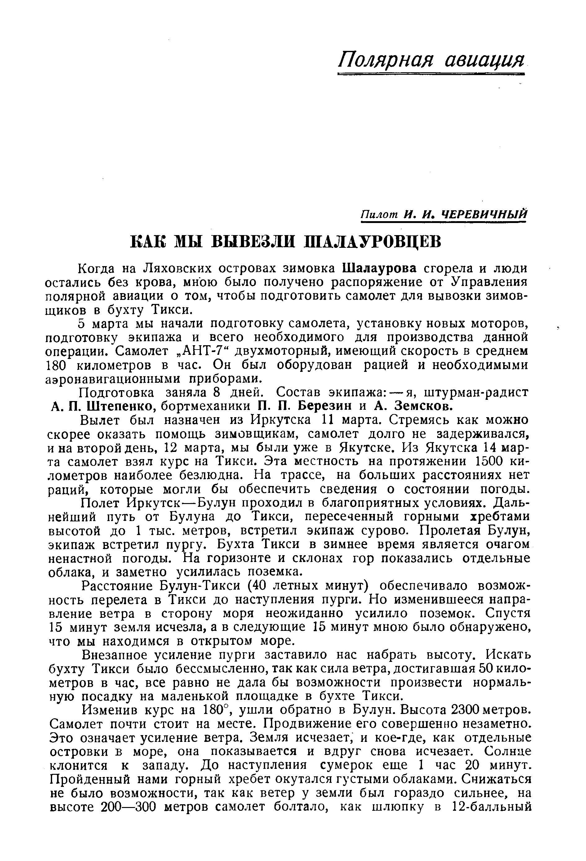 Когда на Ляховских островах зимовка Шалаурова сгорела и люди остались без крова, мною было получено распоряжение от Управления полярной авиации о том, чтобы подготовить самолет для вывозки зимовщиков в бухту Тикси.