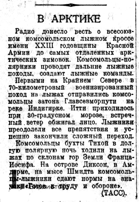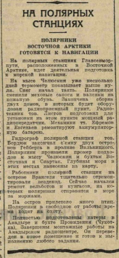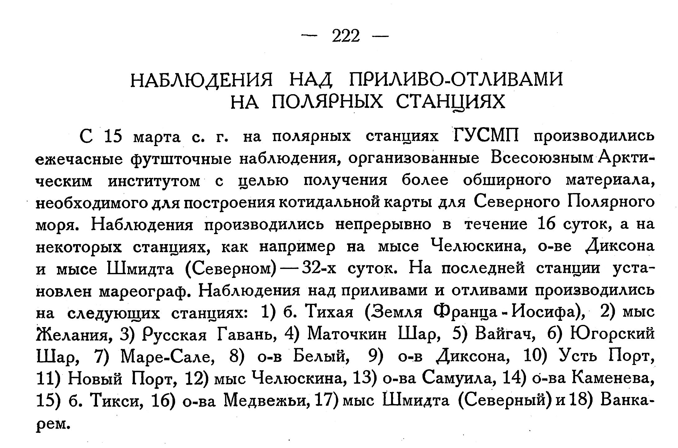 С 15 марта с. г. на полярных станциях ГУСМП производились ежечасные футшточные наблюдения, организованные Всесоюзным Арктическим институтом с целью получения более обширного материала, необходимого для построения котидальной карты для Северного Полярного моря. Наблюдения производились непрерывно в течение 16 суток, а на некоторых станциях, как например на мысе Челюскина, о-ве Диксона и мысе Шмидта (Северном) — 32-х суток. На последней станции установлен мареограф. Наблюдения над приливами и отливами производились на следующих станциях: 1) б. Тихая (Земля Франца - Иосифа), 2) мыс Желания, 3) Русская Гавань, 4) Маточкин Шар, 5) Вайгач, 6) Югорский Шар, 7) Маре-Сале, 08) о-в Белый, 9) о-в Диксона, 10) Усть Порт, 11) Новый Порт, 12) мыс Челюскина, 13) о-ва Самуила, 14) О-ва Каменева, 15) б. Тикси, 16) о-ва Медвежьи, 17) мыс Шмидта (Северный) и 18) Ванкарем.