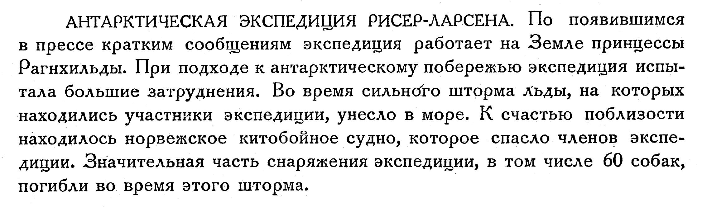 АНТАРКТИЧЕСКАЯ ЭКСПЕДИЦИЯ РИСЕР-ЛАРСЕНА. По появившимся в прессе кратким сообщениям экспедиция работает на Земле принцессы Рагнхильды. При подходе к антарктическому побережью экспедиция испытала большие затруднения. Во время сильного шторма льды, на которых находились участники экспедиции, унесло в море. К счастью поблизости находилось норвежское китобойное судно, которое спасло членов экспедиции. Значительная часть снаряжения экспедиции, в том числе 60 собак, погибли во время этого шторма.