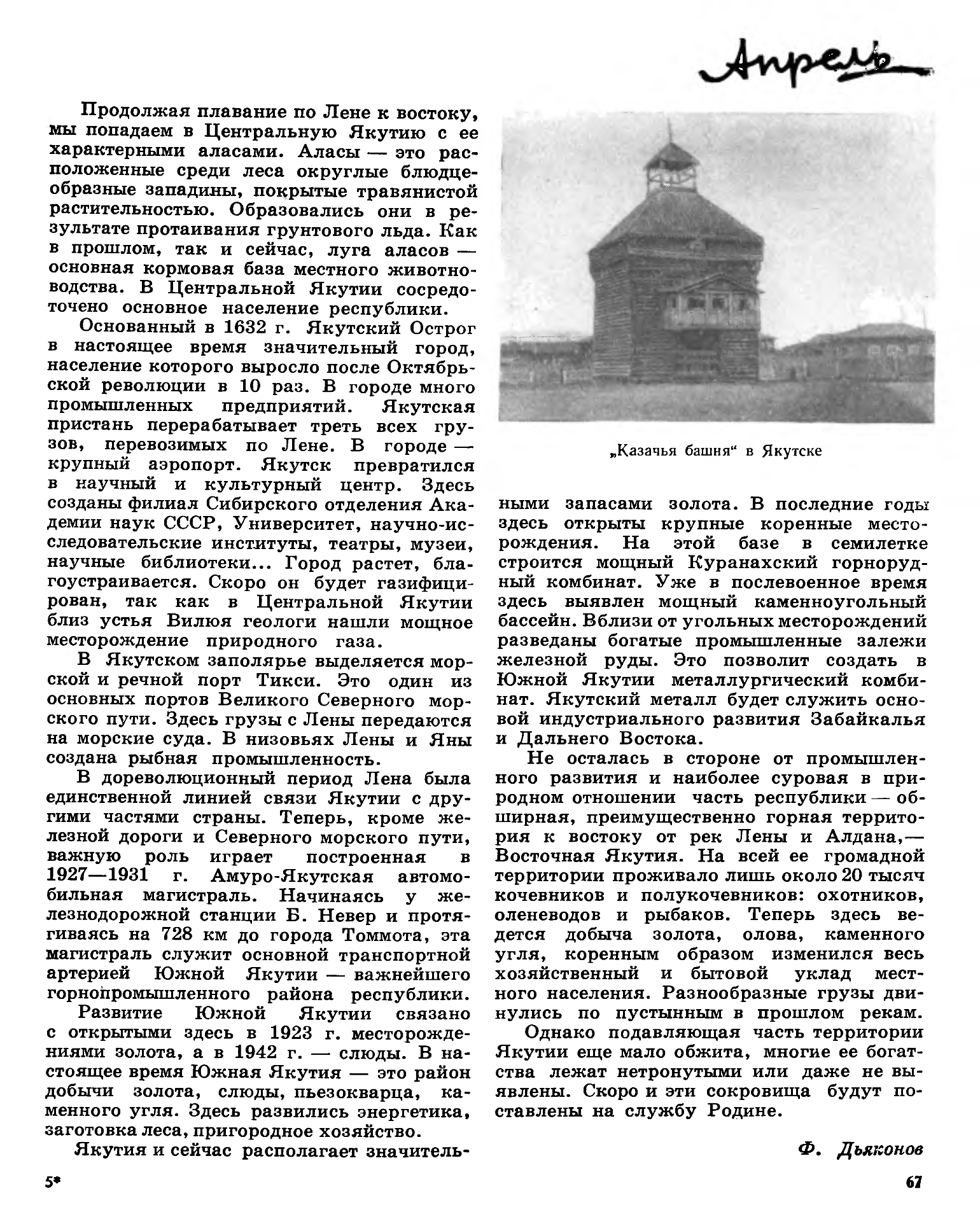 История. Впервые известие о якутах получено было в 1620 г. от мангазейских казаков. В 1627 г. из Енисейска была отправлена партия из 10 казаков с десятником Василием Бугром, достигшая р. Лены в следующем году. Решительные действия начались с 1632 г., когда енисейский сотник Петр Бекетов, с 30 казаками, плывя по Лене до места, где стоит гор. Якутск, покорил по пути якутов, обложил их ясаком и для прочного занятия края заложил Якутский острог. Почти одновременно с основанием Якутска енисейские казаки шли по Лене с ее верховья, а мангазейские пролагали к ней путь с З, спускаясь по р. Вилюю. Еще в 1630 г. отряд мангазейцев, под начальством Васильева, дошел до Лены и покорил вилюйских якутов. Не обошлось без кровавых столкновений между самими русскими из-за права собирания ясака с инородцев. Эти междоусобицы повели к назначению особых воевод и к самостоятельности Якутска. В 1636 г. из Енисейска был отправлен десятник Буза, с 10 казаками, с наказом осмотреть реки, текущие в Сев. Ледовитый океан. Прозимовав в Олекминском остроге, основанном енисейскими же казаками в 1635 г. против устья р. Олекмы и впоследствии перенесенного на место, где теперь стоит г. Олекминск, Буза, с присоединившимися к нему промышленниками, двинулся в 1637 г. вниз по р. Лене и через 2 месяца достиг западного устья Лены, откуда, идя по морю на запад, дошел до устья р. Оленека. В 1638 г. основан был Верхоянск в виде зимовья. В Якутске тогда числилось до 200 жит. В том же году атаман Максим Перфильев поднимался по р. Витиму и, перезимовав, достиг устья р. Ципы. Неутомимый Буза в том же году снова спустился по р. Лене и, выйдя в океан ее восточным устьем, дошел до устья р. Яны; здесь он зазимовал, а в следующем году опять пустился по морю на З и дошел до устья р. Чендоны. В том же 1638 г. казак Постник дошел до р. Индигирки и основал здесь зимовье, спутники же его в 1639 г. на двух выстроенных ими кочах спустились по р. в Северный Ледовитый океан и добрались до устья р. Алазеи. В 1644 г. казак Михайло Стадухин открыл р. Колыму, основал Нижне-Колымское зимовье, доставил первые сведения о чукчах и заложил Средне-Колымский острожек. В 1645 г. произошло восстание юкагир. В 1648 г. казак Дежнев с товарищами Анкудимовым и Алексеевым морем добрались до р. Анадыря. В 1650 р. казак Мотора прошел сухим путем от р. Анюя до устья р. Анадыря, а Стадухин достиг р. Пенжены и открыл ее устье. В 1682 г., при воеводе Приклонском, якуты сделали последнюю попытку к восстанию, к ним присоединились раскольники и даже некоторые казаки. Восстание кончилось полным их разгромом. Остатки разбитых якутов бежали за р. Яну; воевода отправил за ними отряд из 70 человек, приказывая им истреблять бежавших и обложить ясаком каменных ламутов. В котловине Эллер-Собит ламуты подкараулили этот отряд и истребили его; только трое из отряда спаслись бегством. В 1702 г. якутские казаки были организованы в полк, численностью в 1500 чел., под командой казачьего головы, с подчинением якутским воеводам; в 1767 г. полк переименован в команду и подчинен иркутскому обер-коменданту. В 1730 г. известный сибирский историк Миллер занимался в Якутске разработкой местных архивов. В 1735 г. в Якутске был Беринг, отправлявшийся в свою ученую экспедицию. В том же году на Лене у Якутска были построены 2 шлюпки — «Якутск» и «Иркутск», на которых отправились для описи берегов и Сев. Лед. океана Прончищев и Ласениус